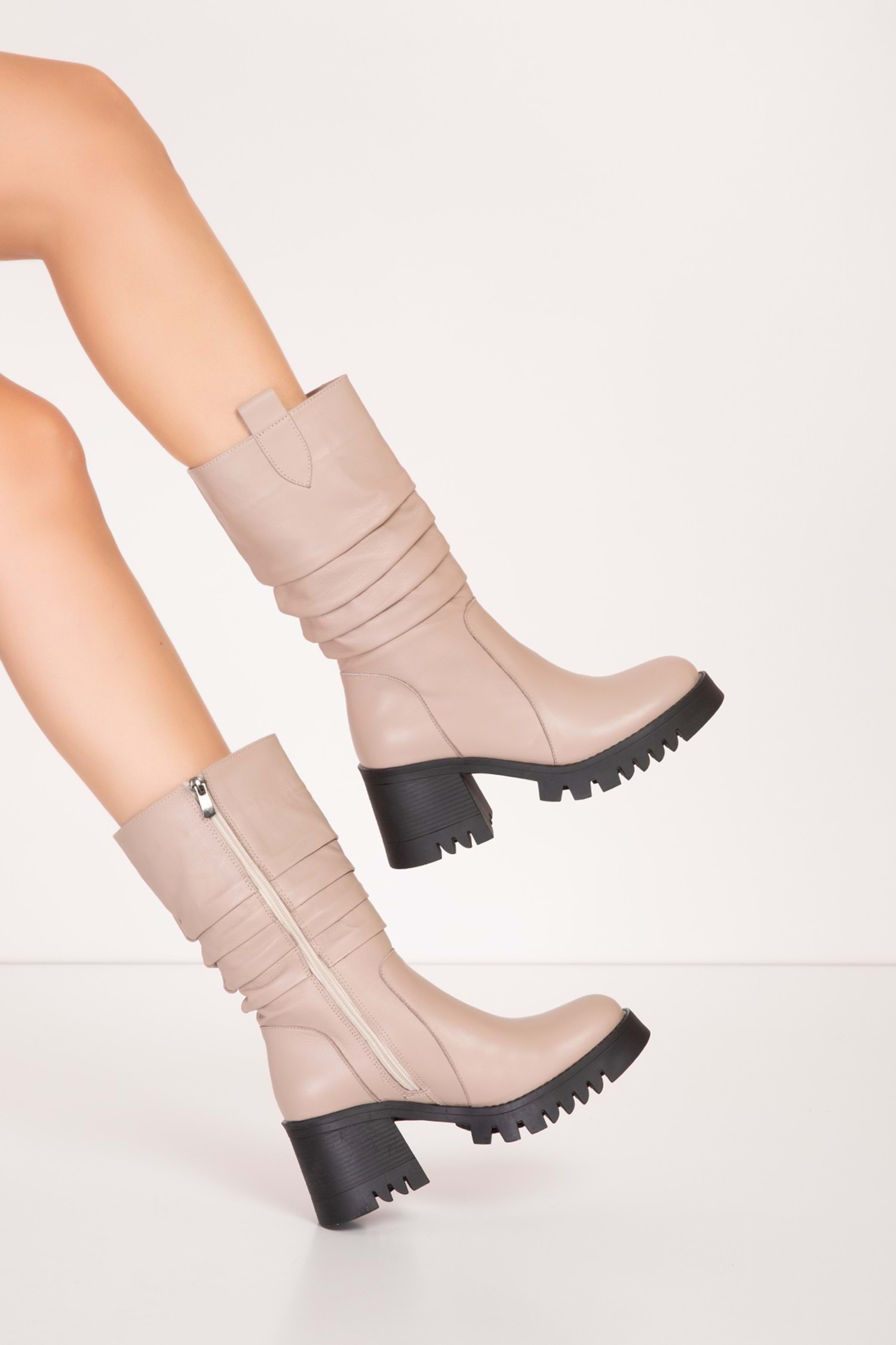 Gondol Hakiki Deri Büzgülü Topuklu Çizme bel.1548 - Bej - 37