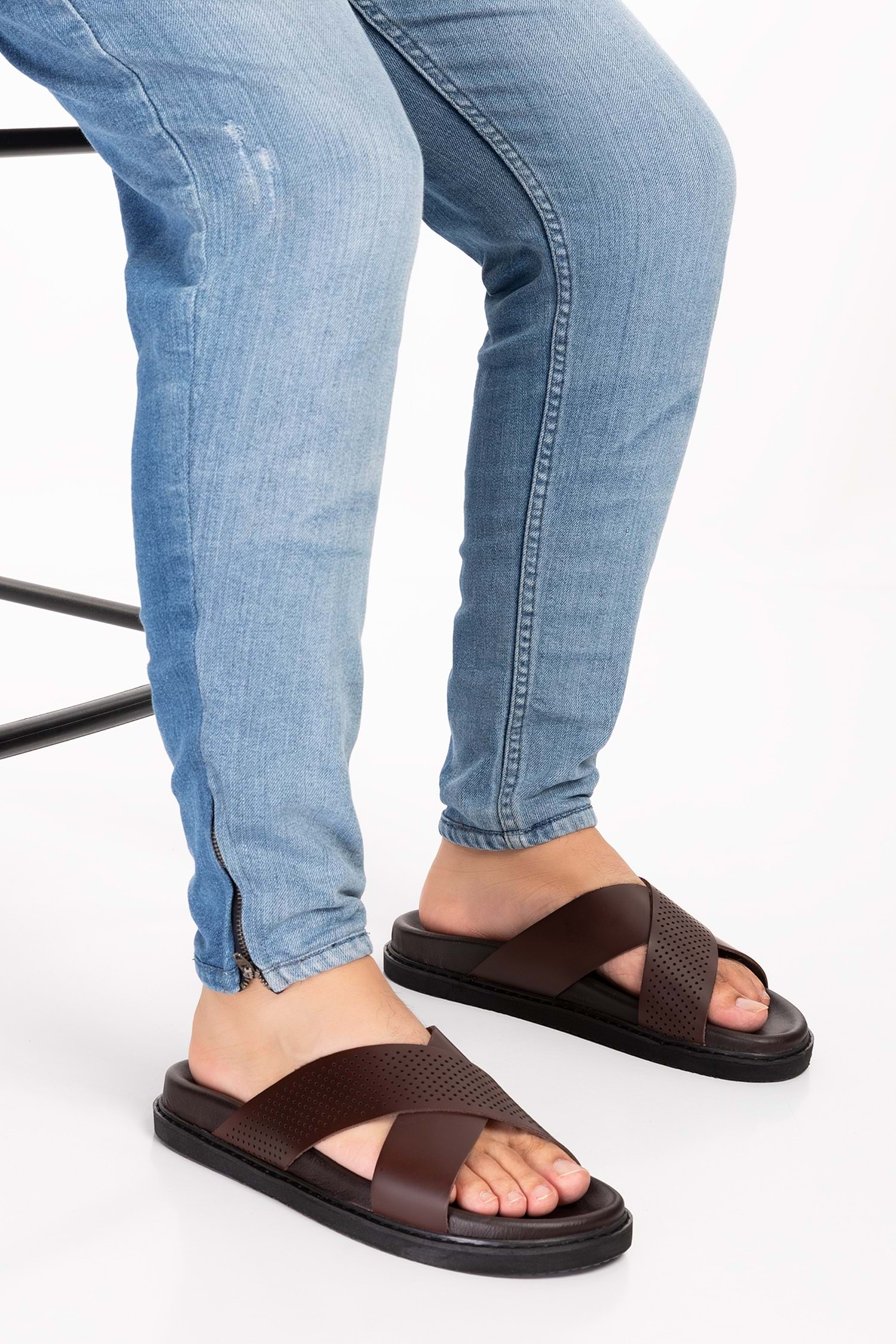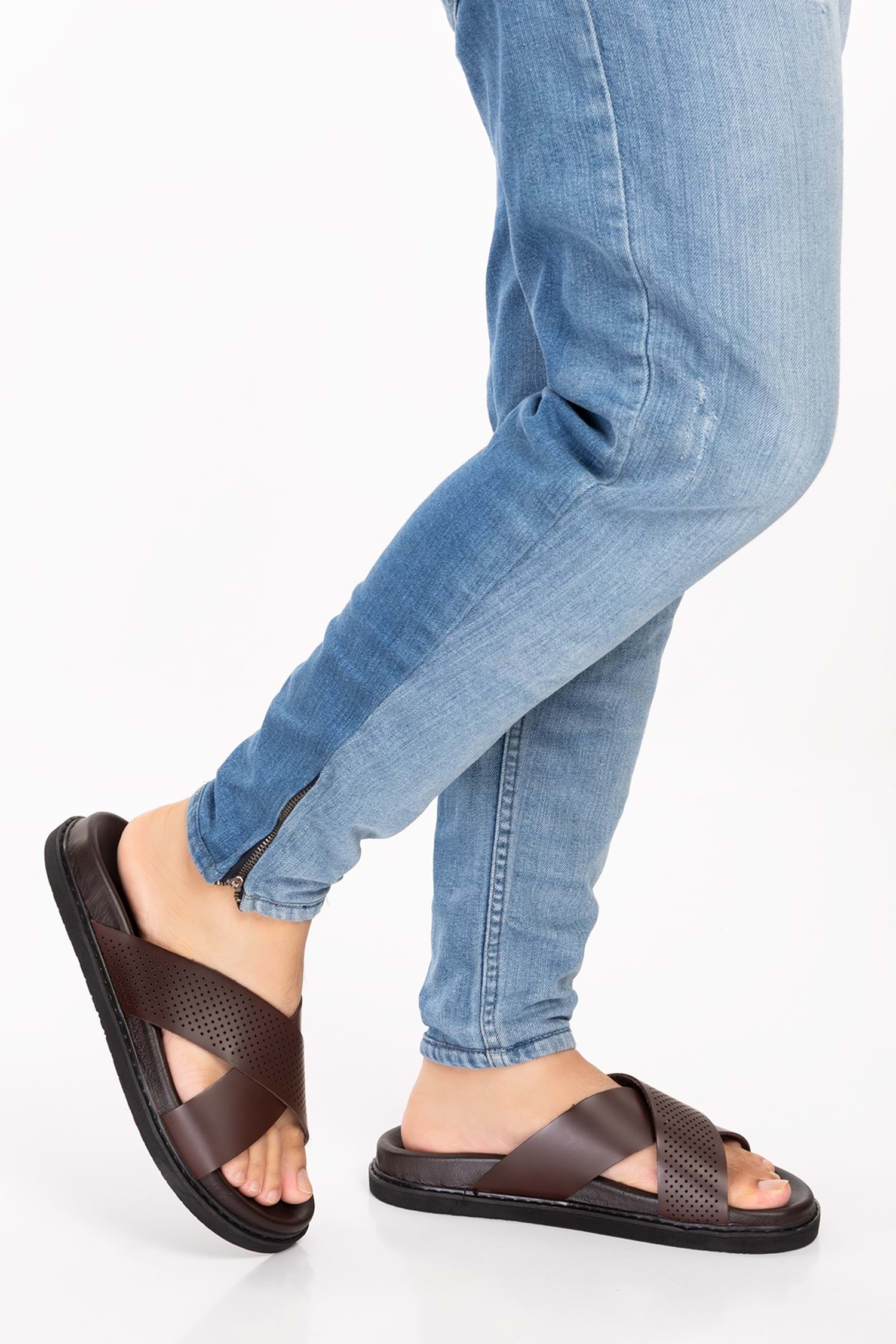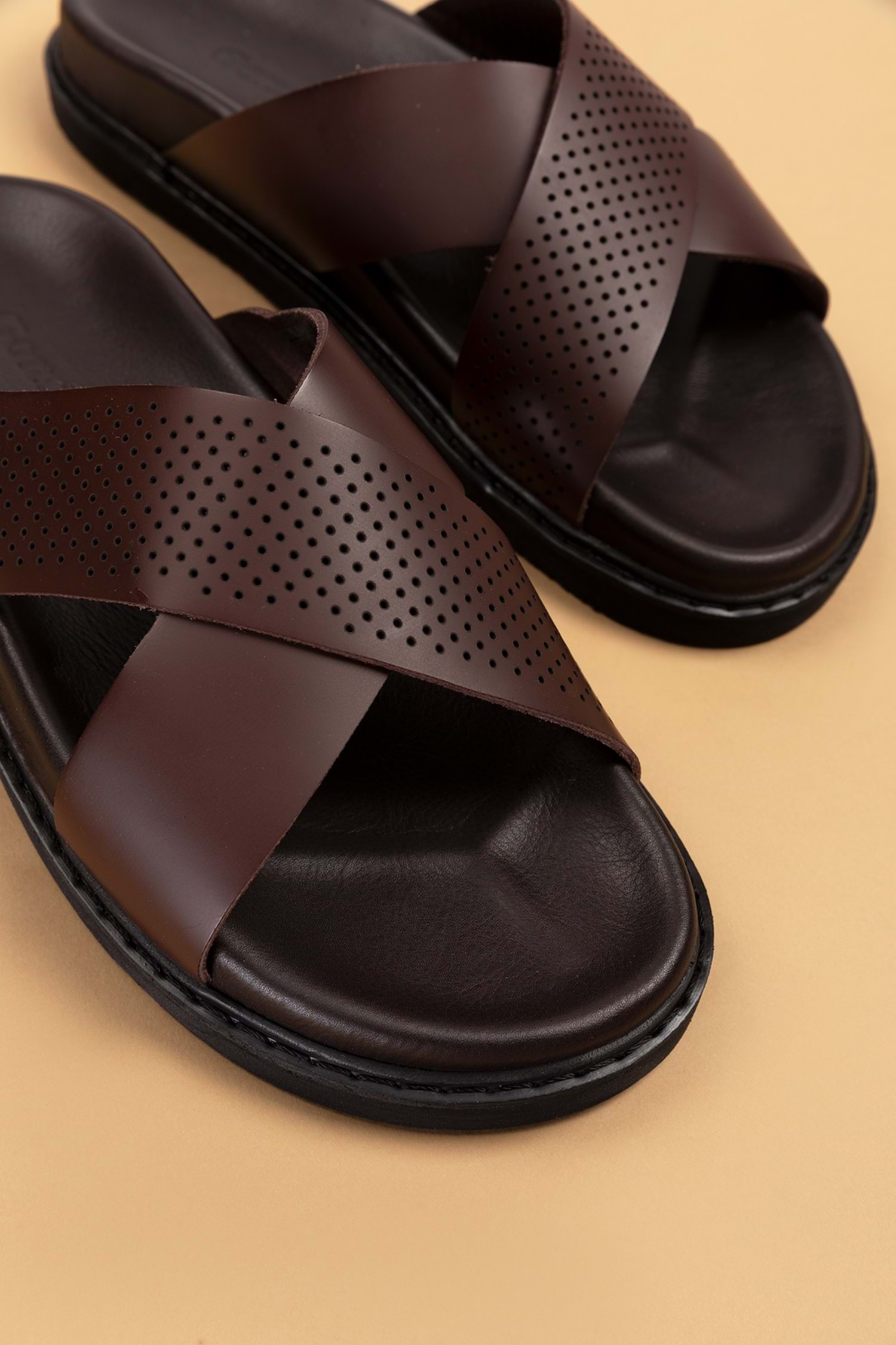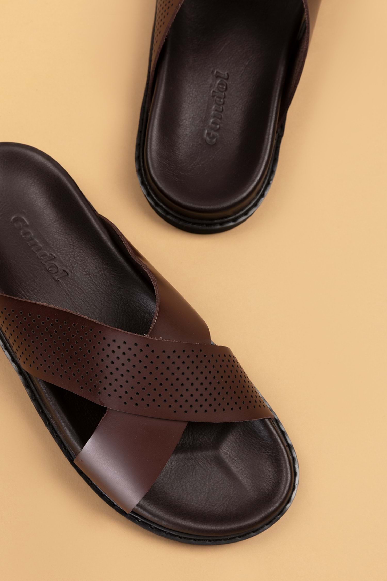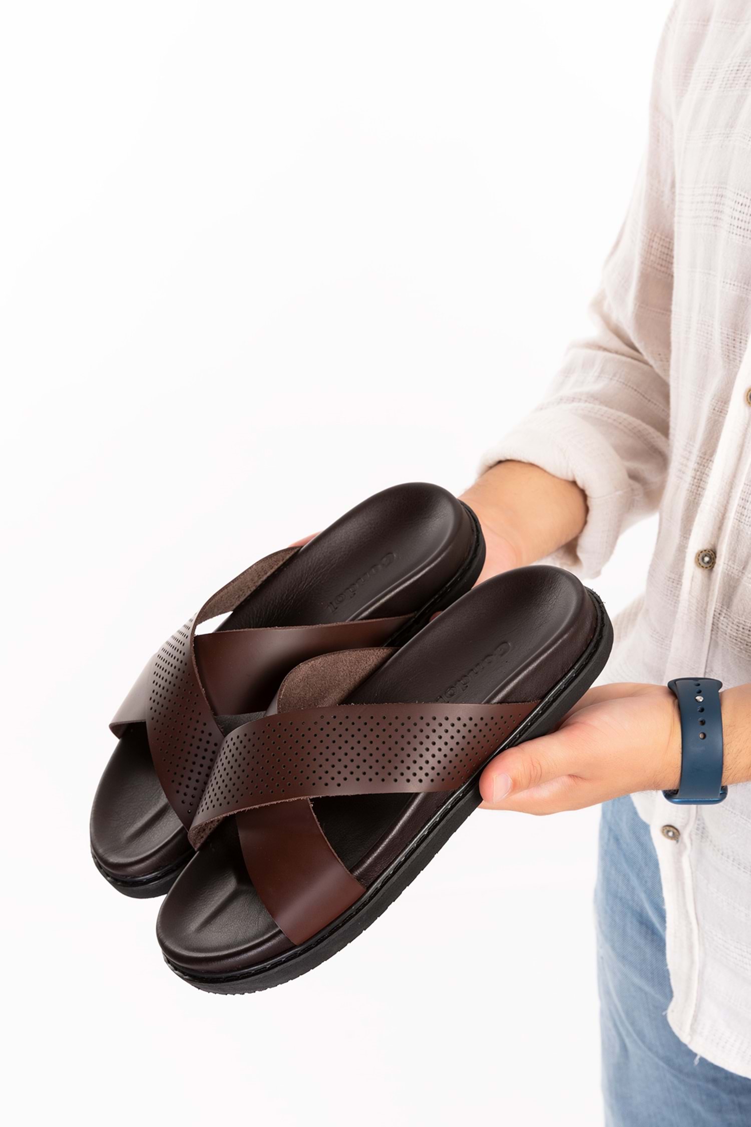 Gondol Erkek Hakiki Deri Çapraz Bant Klasik Terlik esm.2024 - Kahverengi - 45