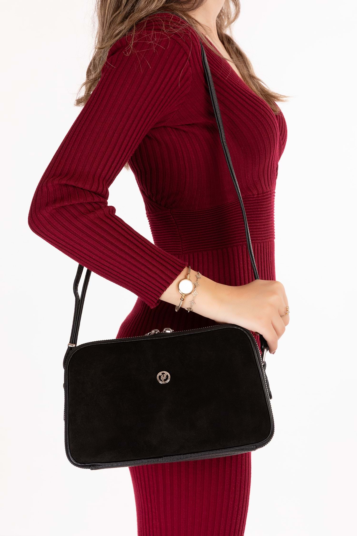 Gondol Kadın Süet Deri Günlük Çapraz Omuz Çantası gp.1321 - Siyah Süet - TEK EBAT