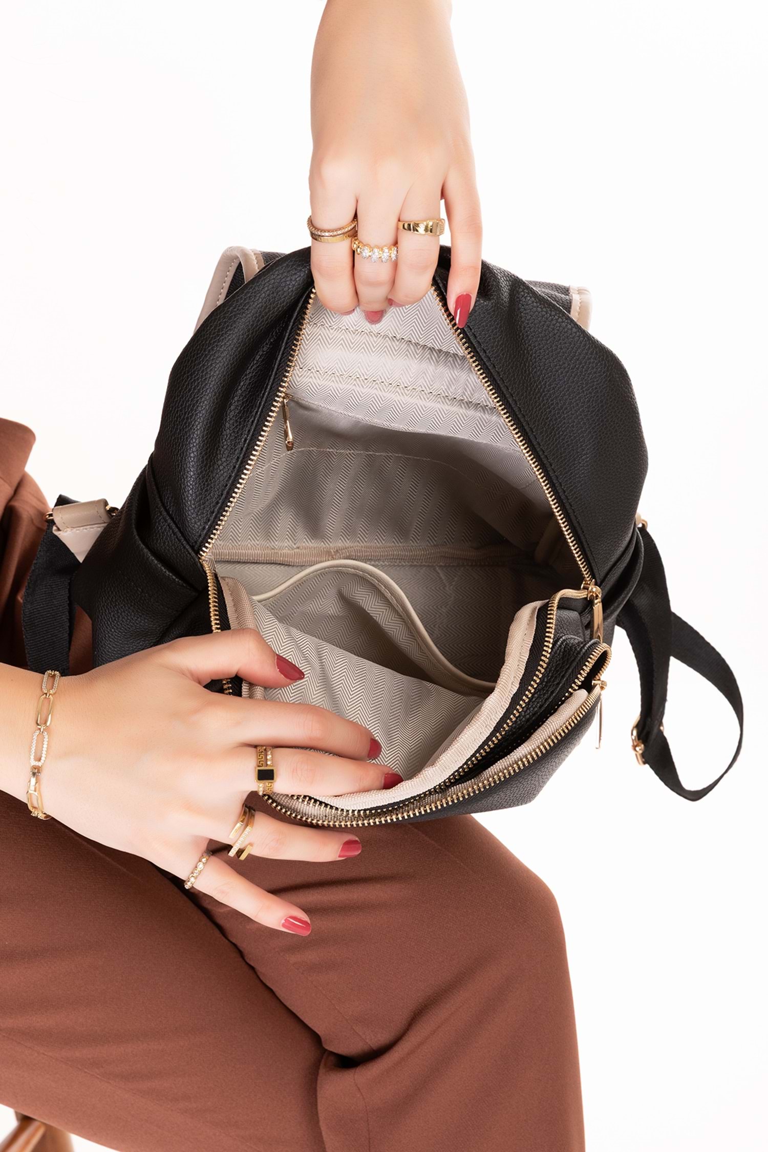 * Taşıma Şekli: El ve Sırt * Eni:32 cm * Boyu:32 cm * Derinliği:12 cm * Materyal:Suni Deri * Yardımcı Materyal:Mat Suni Deri * Dış Materyal : Suni Deri * İç Materyal:%100 Dokuma Astarlı * Doku:Yumuşak * Askı Özellik:Ayarlanabilir Uzun Askı Mevcut * Kapama Detay:Fermuarlı