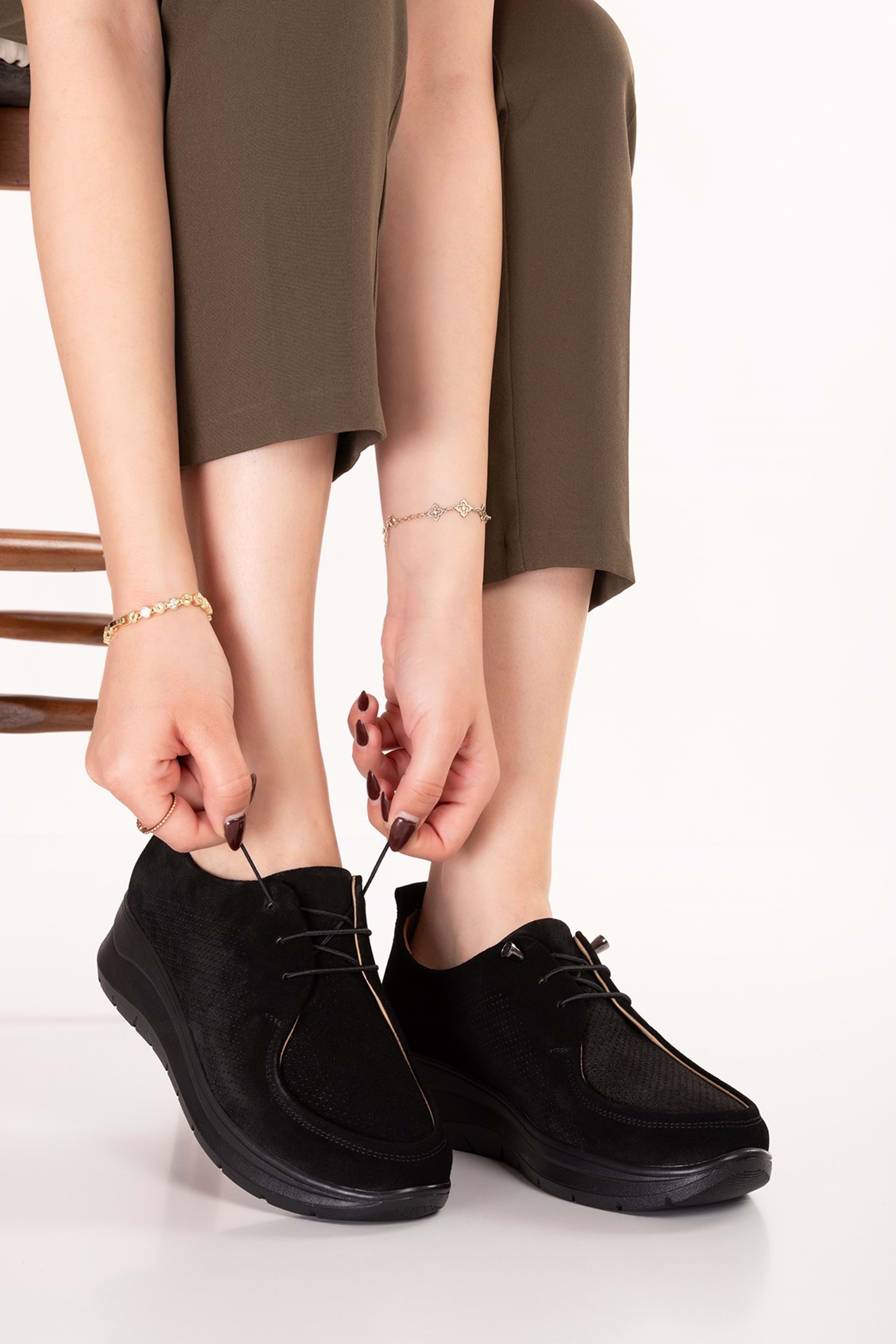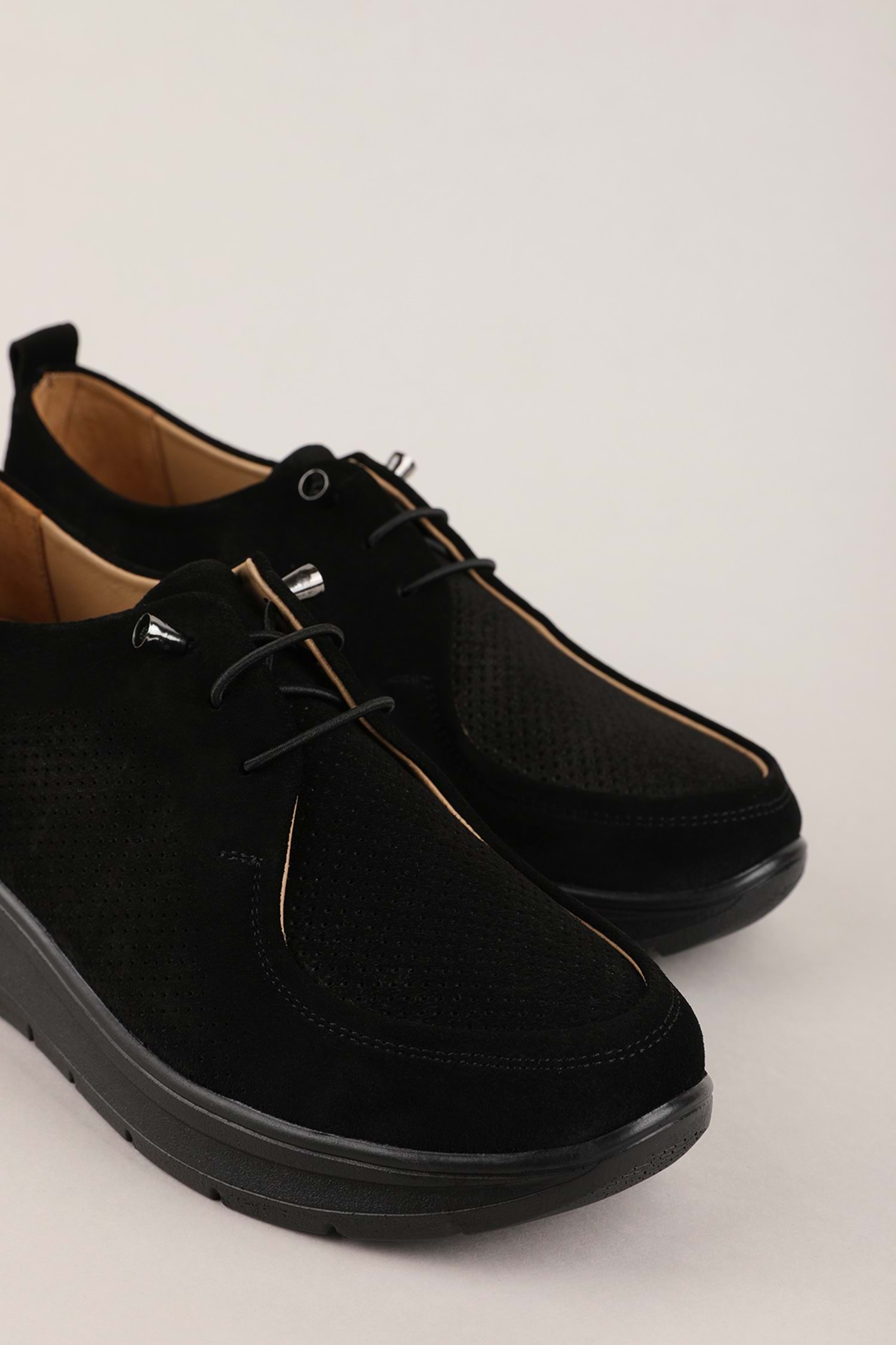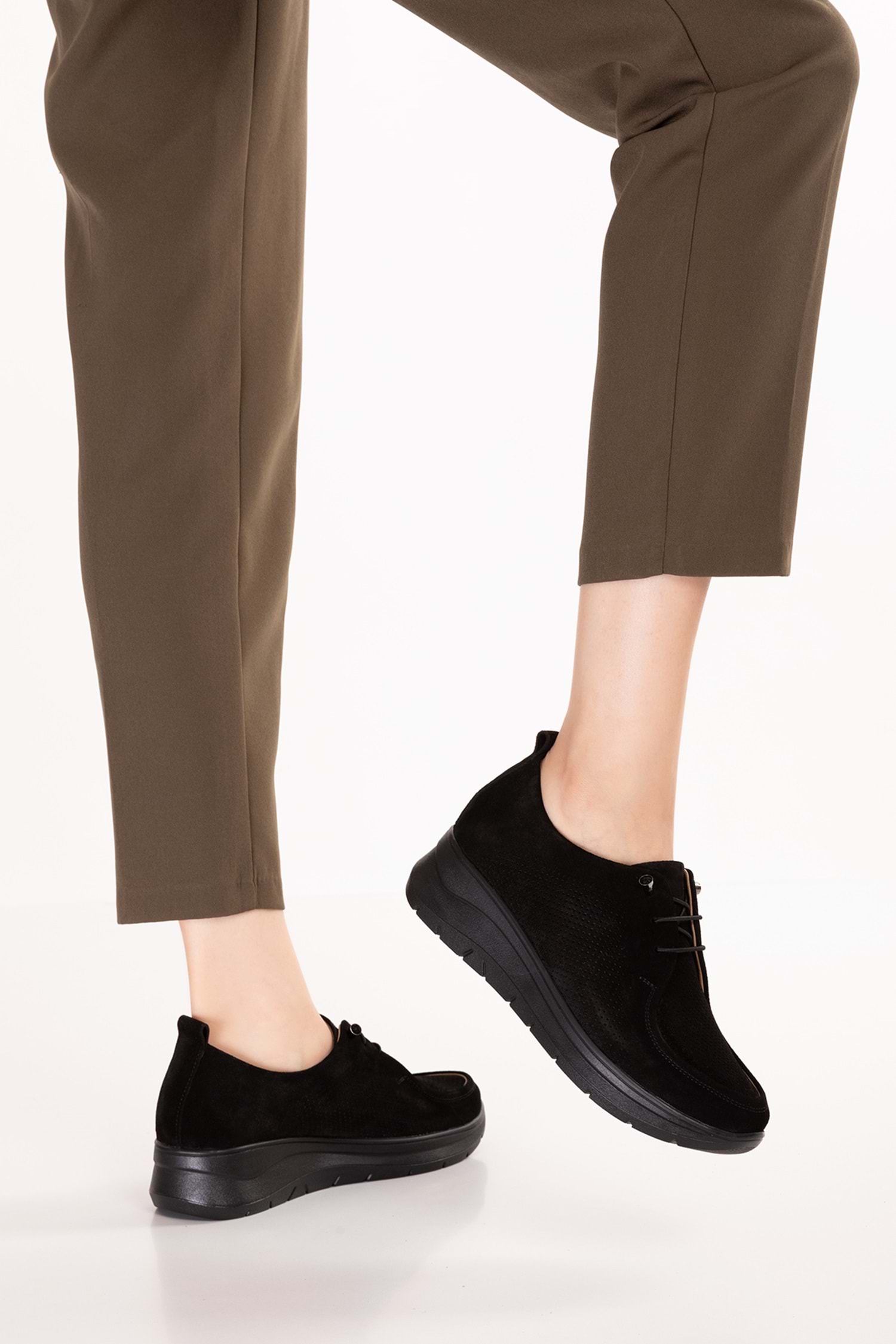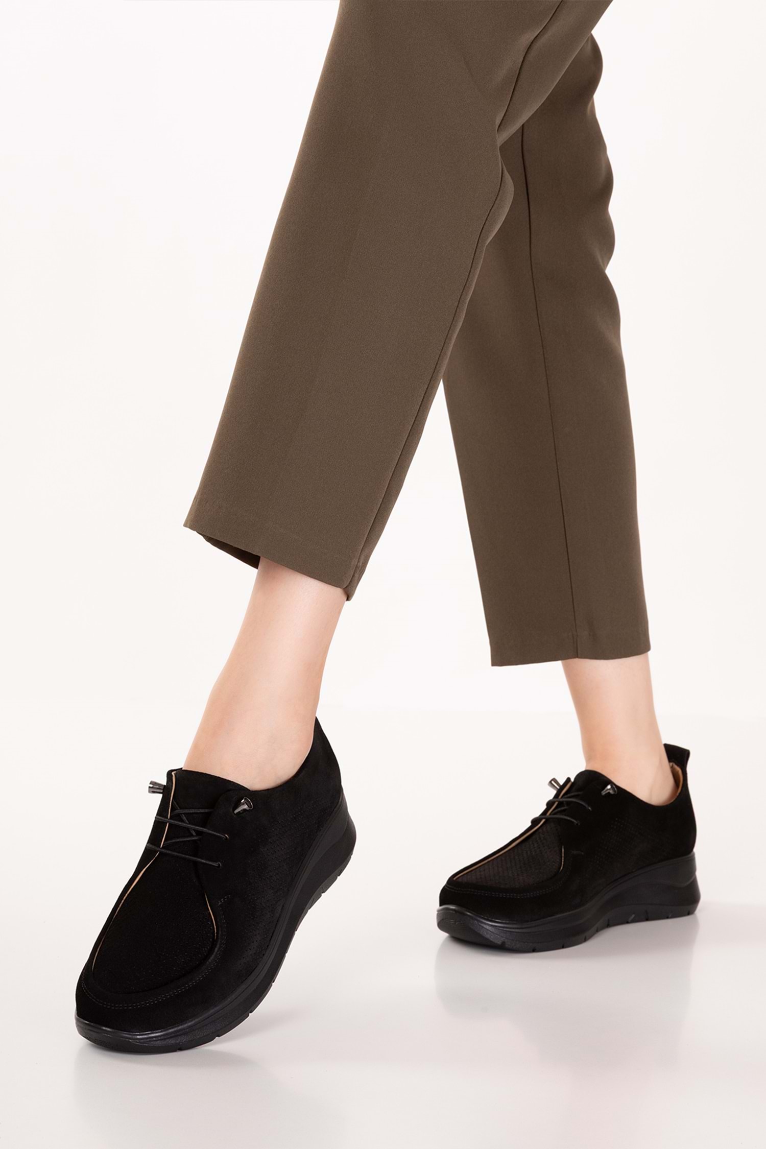 Özellikler • %100 hakiki süet deri • Delikli, nefes alabilen üst yüzey • Bağcıklı şık detay • Hafif ve esnek taban • Kaymaz taban yapısı • Günlük kullanıma uygun • Standart kalıp 4 cm topuk