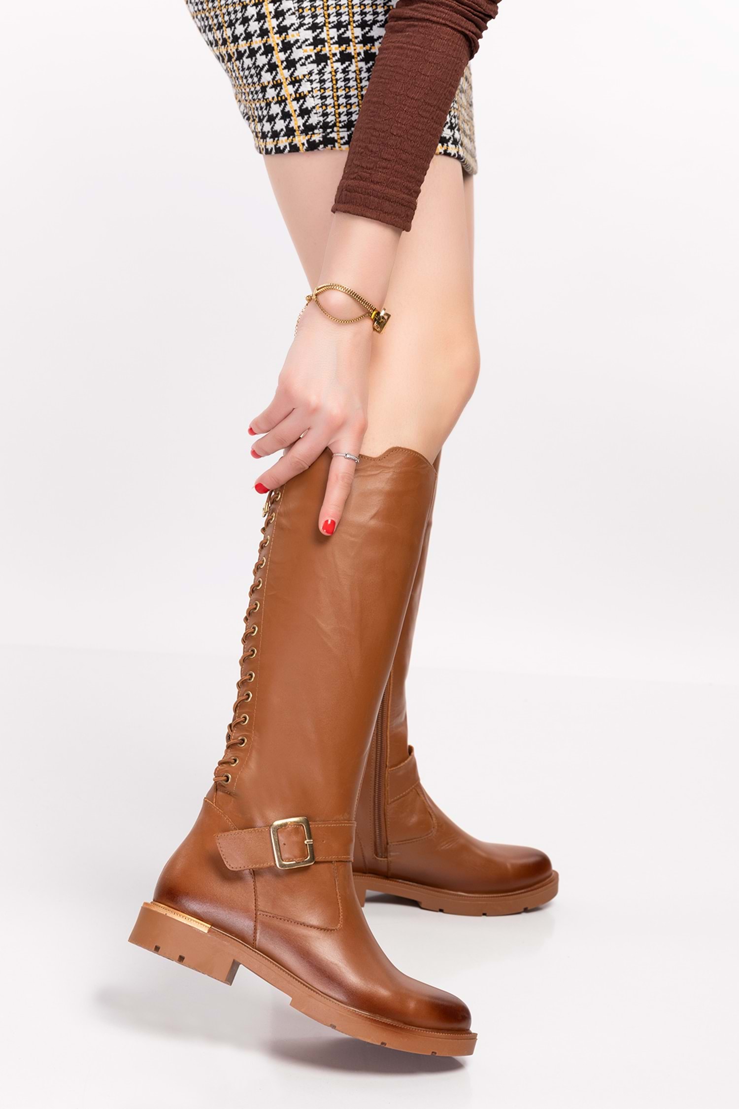 %100 Hakiki Deri Çizme Arka Bağcık Detaylı Fermuarlı