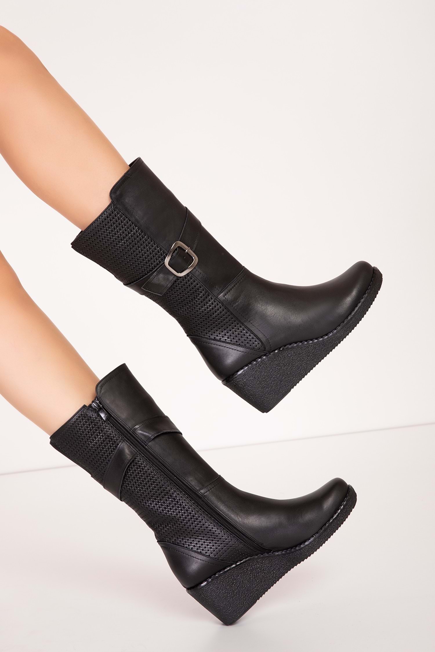 Gondol Hakiki Deri Dolgu Topuklu Günlük Çizme ell.7063 - Siyah Cilt - 34