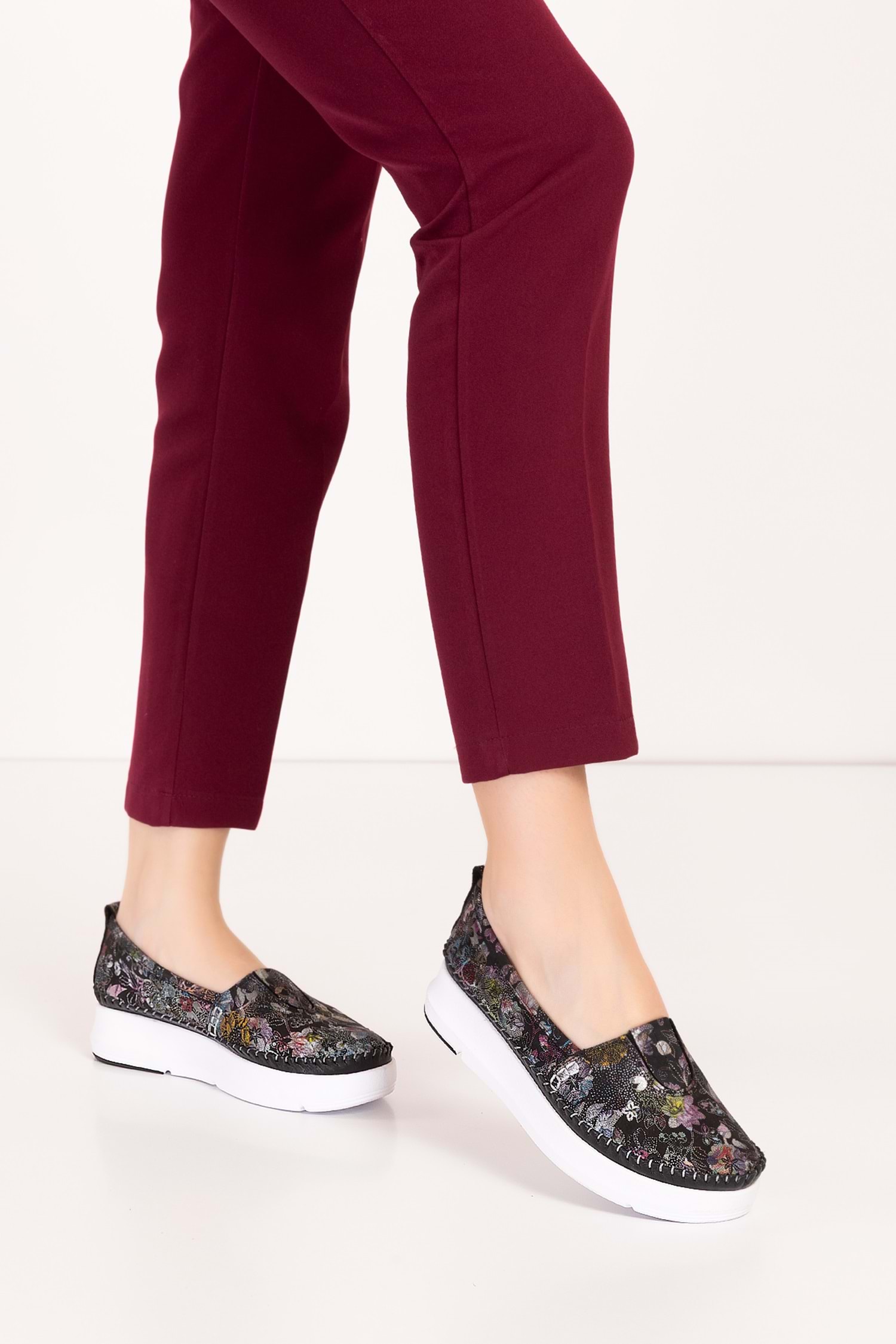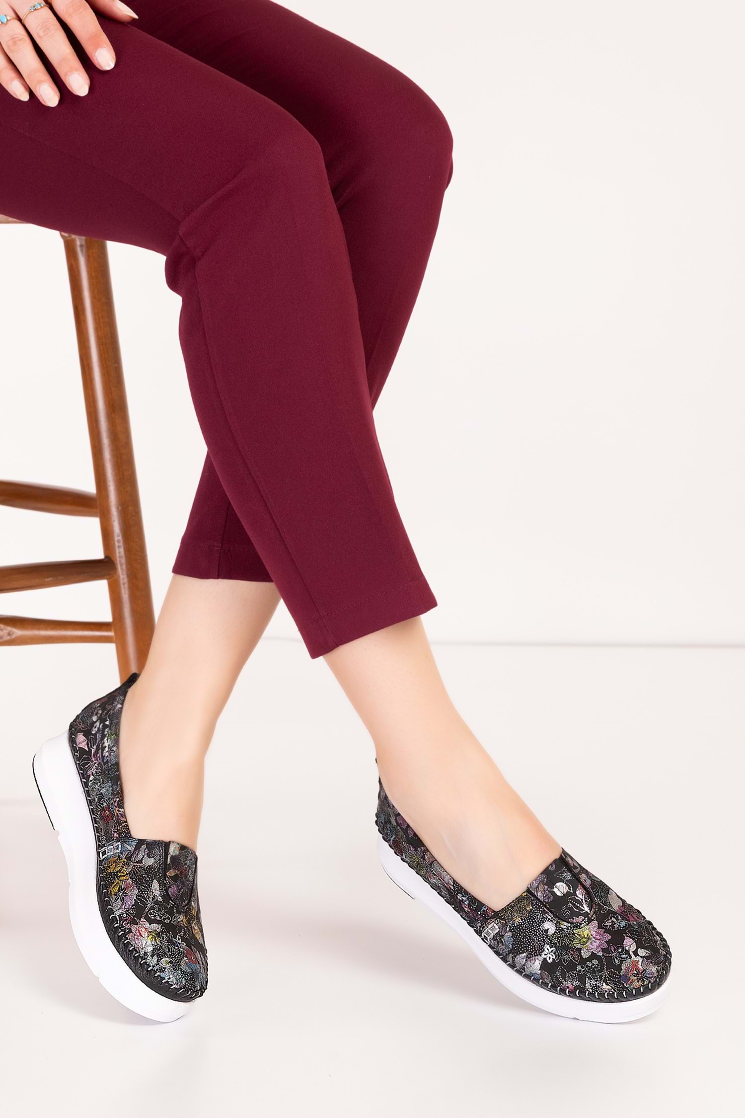 Gondol Hakiki Deri Rahat Yazlık Çiçek Desenli Ayakkabı kla.24 - Siyah - 36
