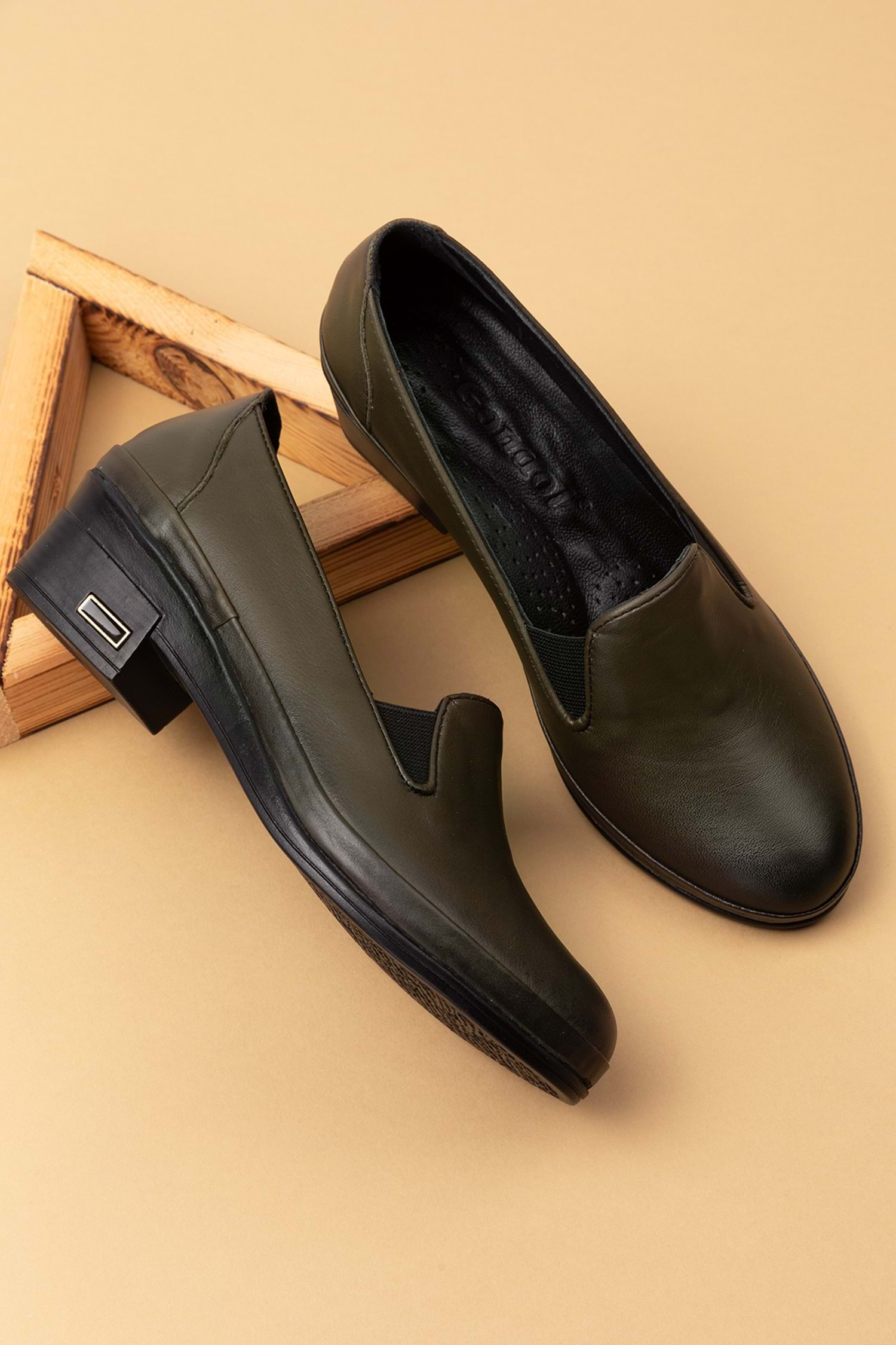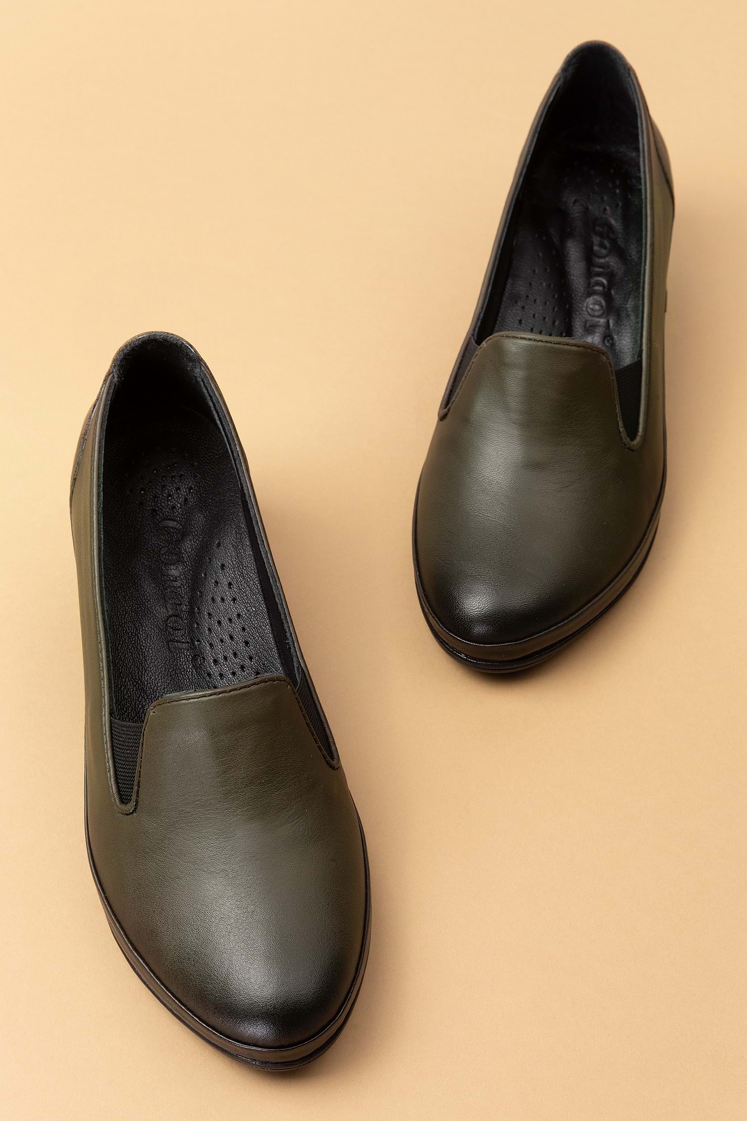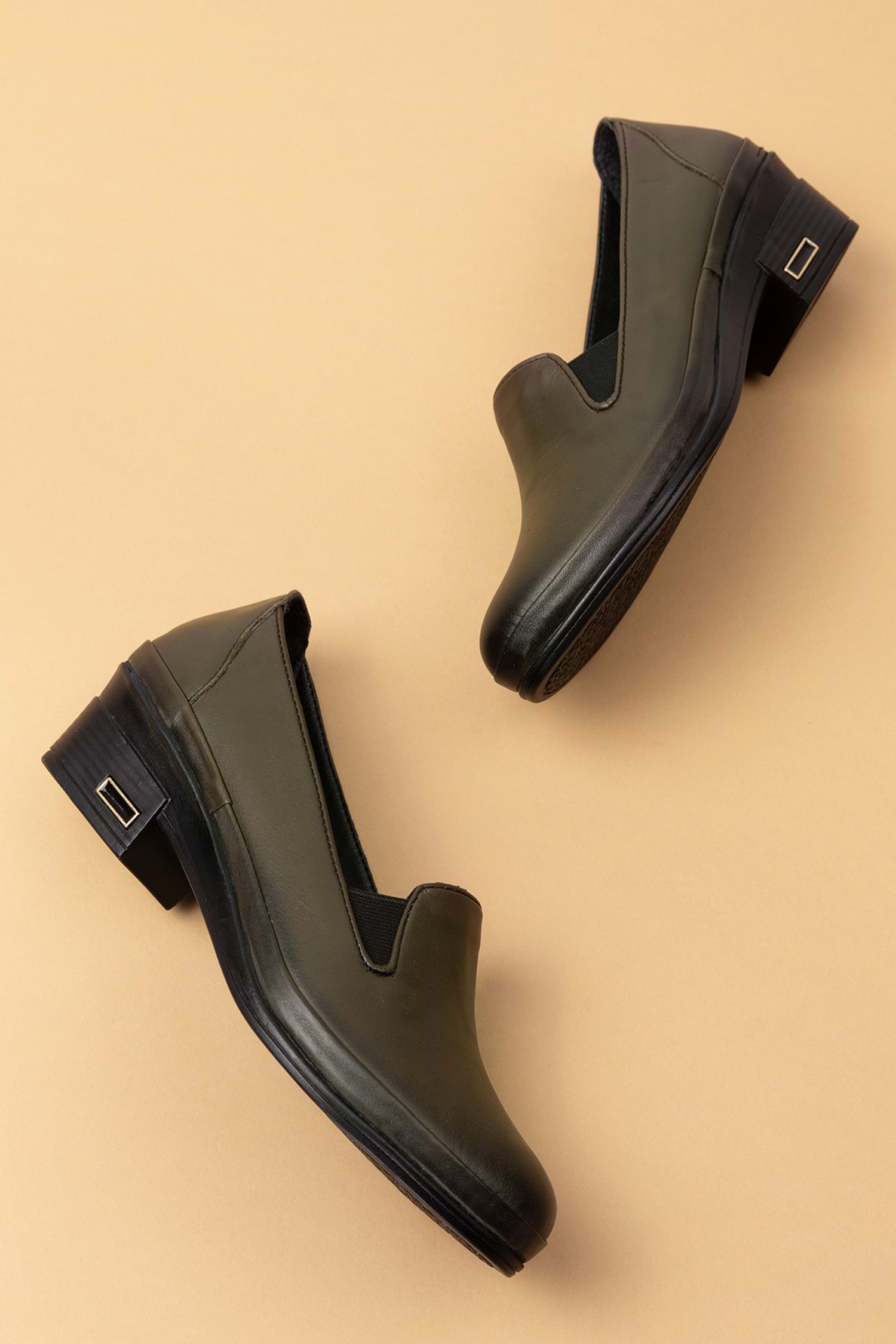 Gondol Hakiki Deri Kısa Topuklu Lastik Detaylı Ayakkabı msa.65 - Haki Cilt - 40
