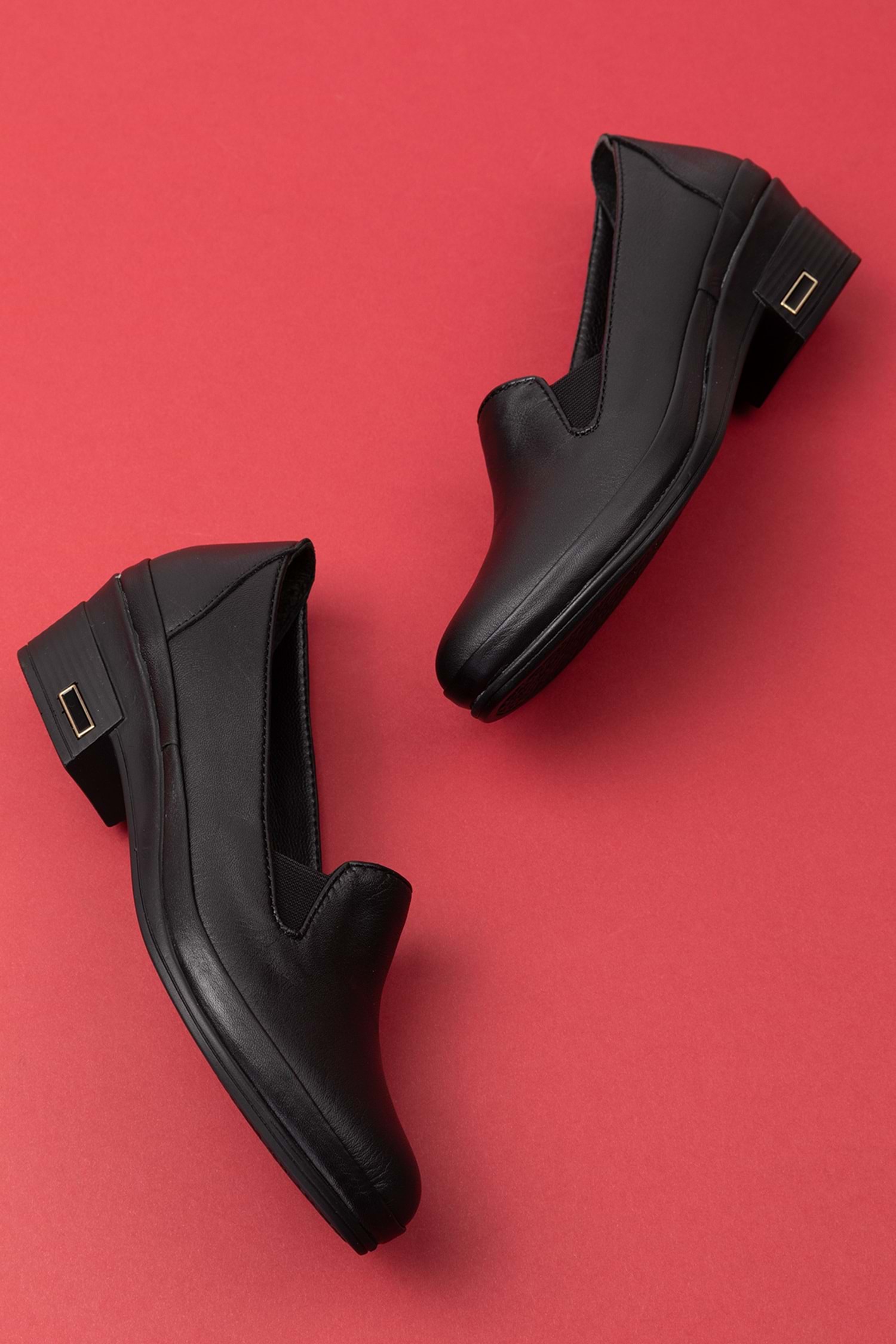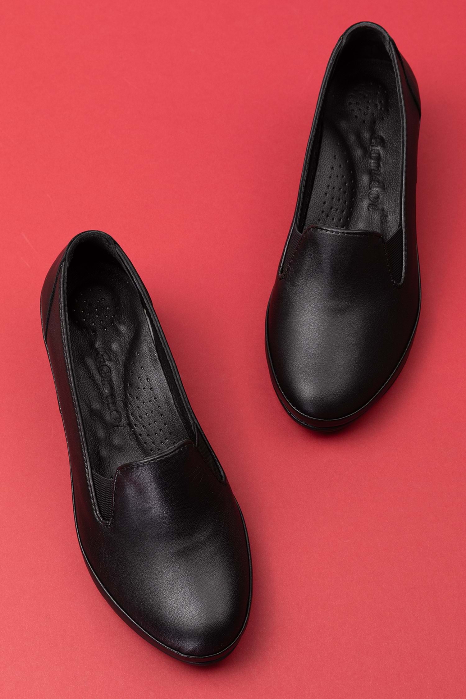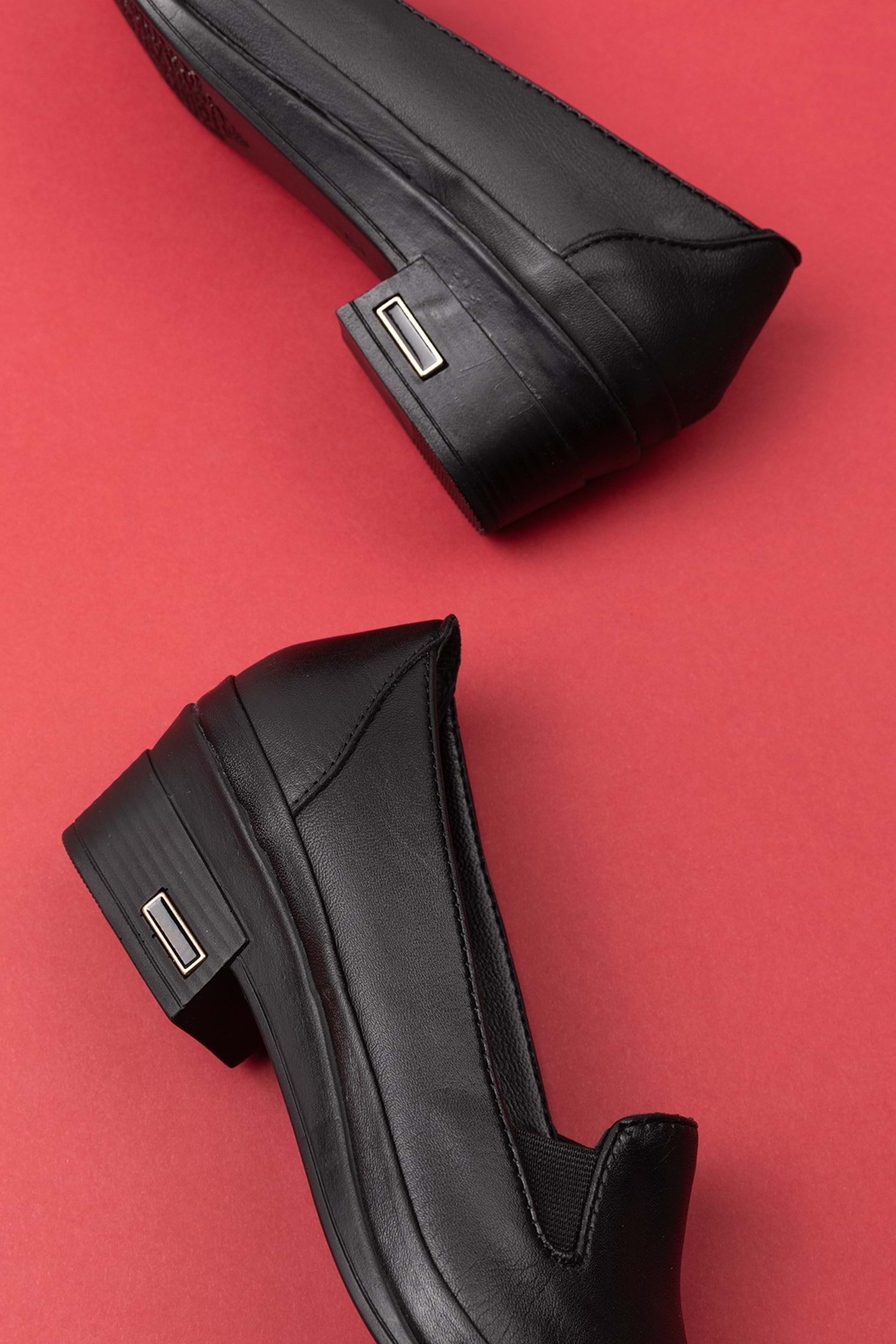 Gondol Hakiki Deri Kısa Topuklu Lastik Detaylı Ayakkabı msa.65 - Siyah Cilt - 40