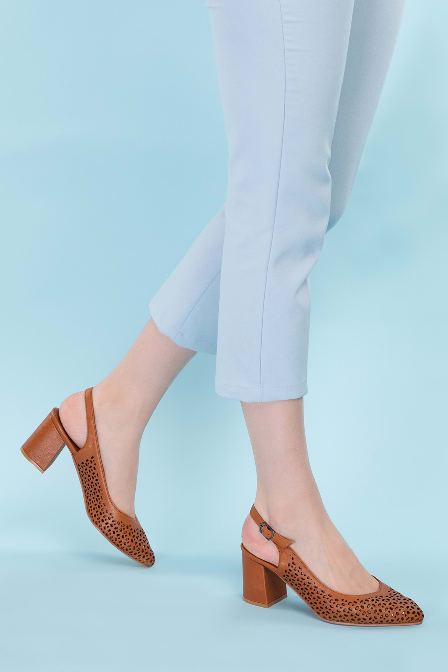Gondol Hakiki Deri Lazer Kesim Şık Topuklu Ayakkabı şhn.876 - Taba - 35