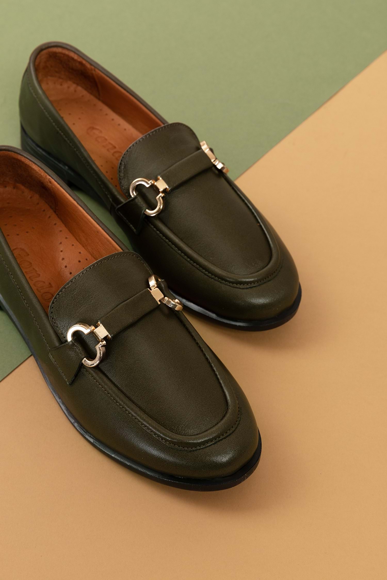 Gondol Hakiki Deri Kadın Tokalı Loafer esl.1852 - Haki - 36