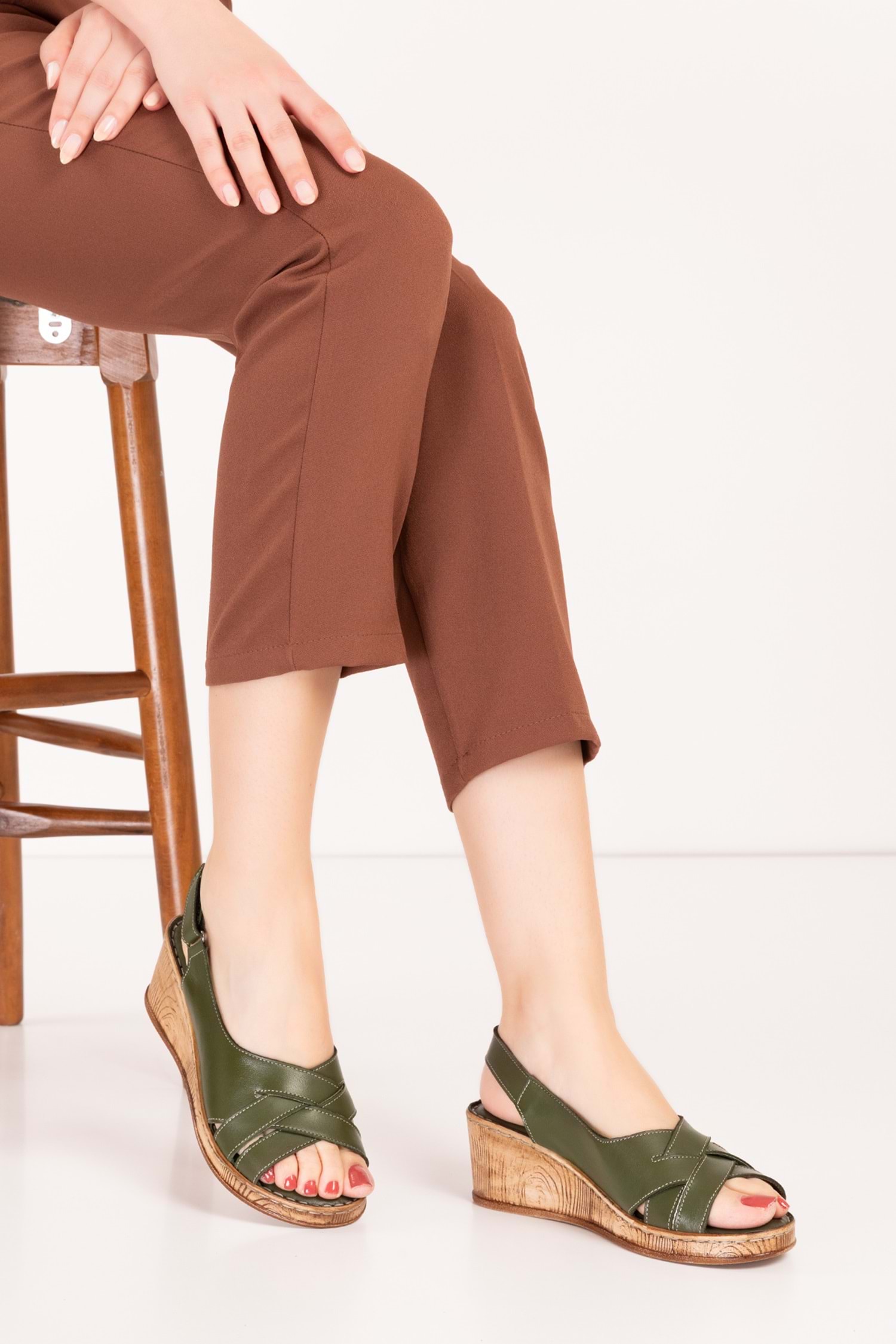 Gondol Hakiki Deri Dolgu Topuklı Yumuşak Taban Rahat Sandalet irm.06 - Haki - 40