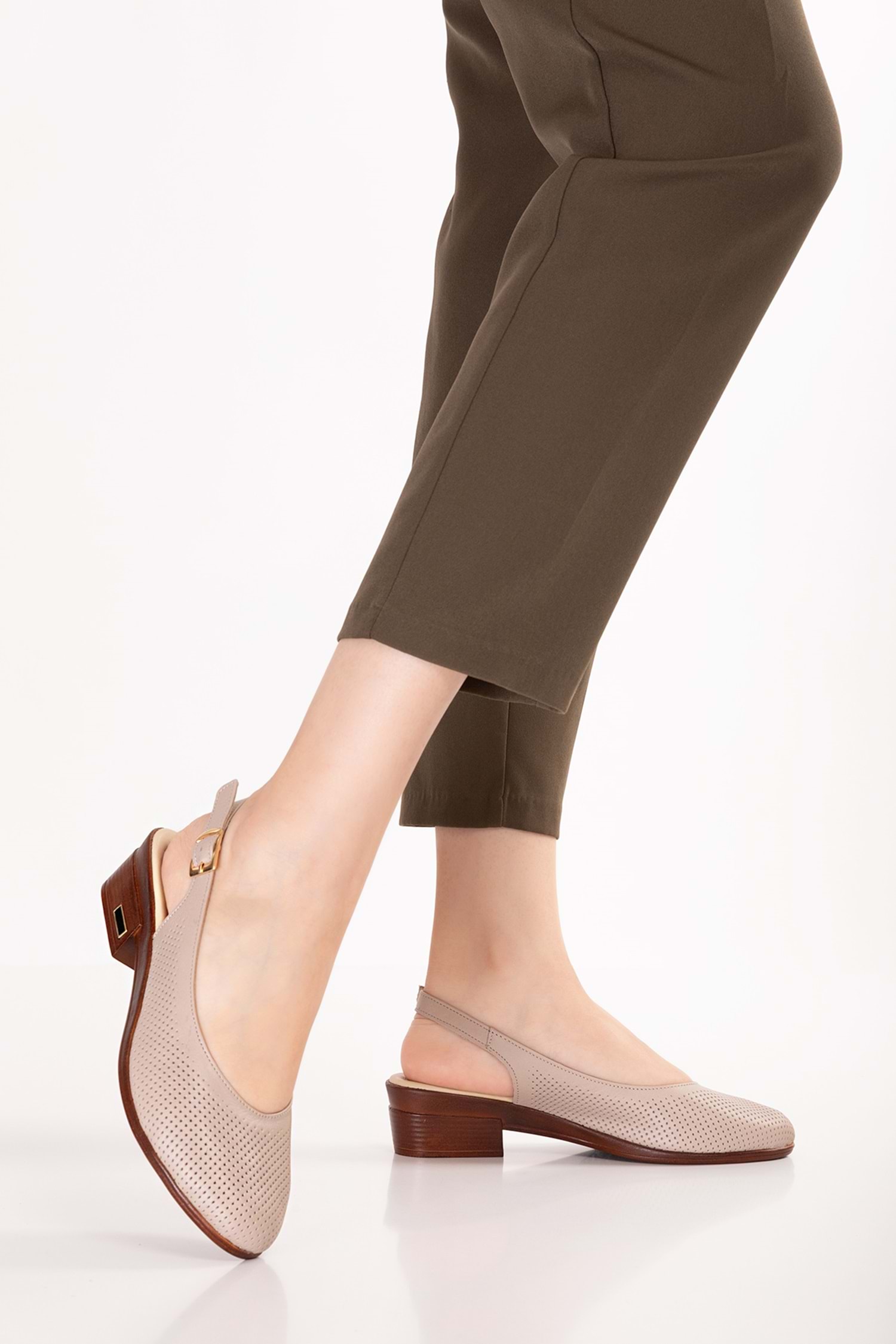 Gün boyu konforu şıklıkla birleştiren hakiki deri dolgu topuk kadın sandalet, zamansız bej rengiyle yaz kombinlerinin vazgeçilmezi olmaya aday. Yumuşak deri yapısı ayağı sarar, çapraz bant tasarımı hem estetik hem de dengeli bir duruş sağlar.