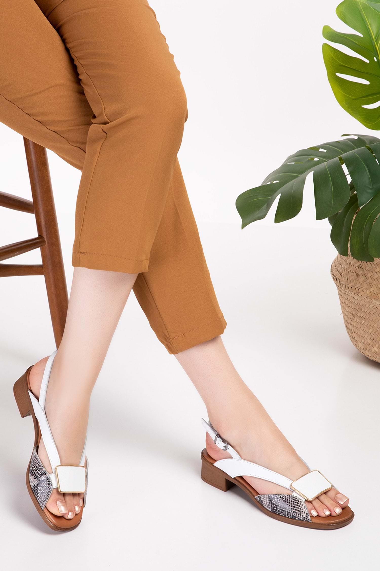 Gondol Hakiki Deri Kısa Topuklu Toka Detay Şık Sandalet iz.6020 - Beyaz Yılan - 36