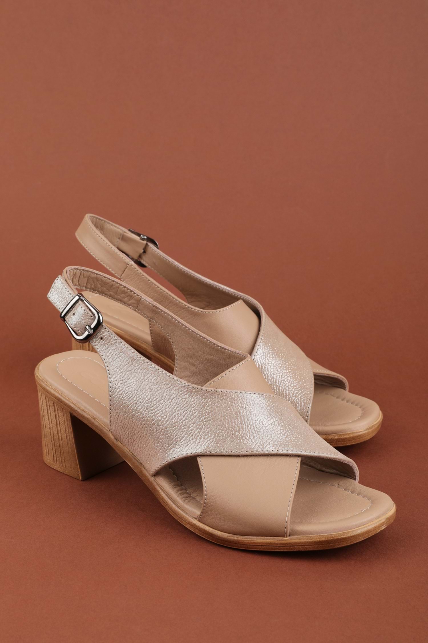 Gün boyu konforu şıklıkla birleştiren hakiki deri dolgu topuk kadın sandalet, zamansız bej rengiyle yaz kombinlerinin vazgeçilmezi olmaya aday. Yumuşak deri yapısı ayağı sarar, klasik tasarımı hem estetik hem de dengeli bir duruş sağlar.