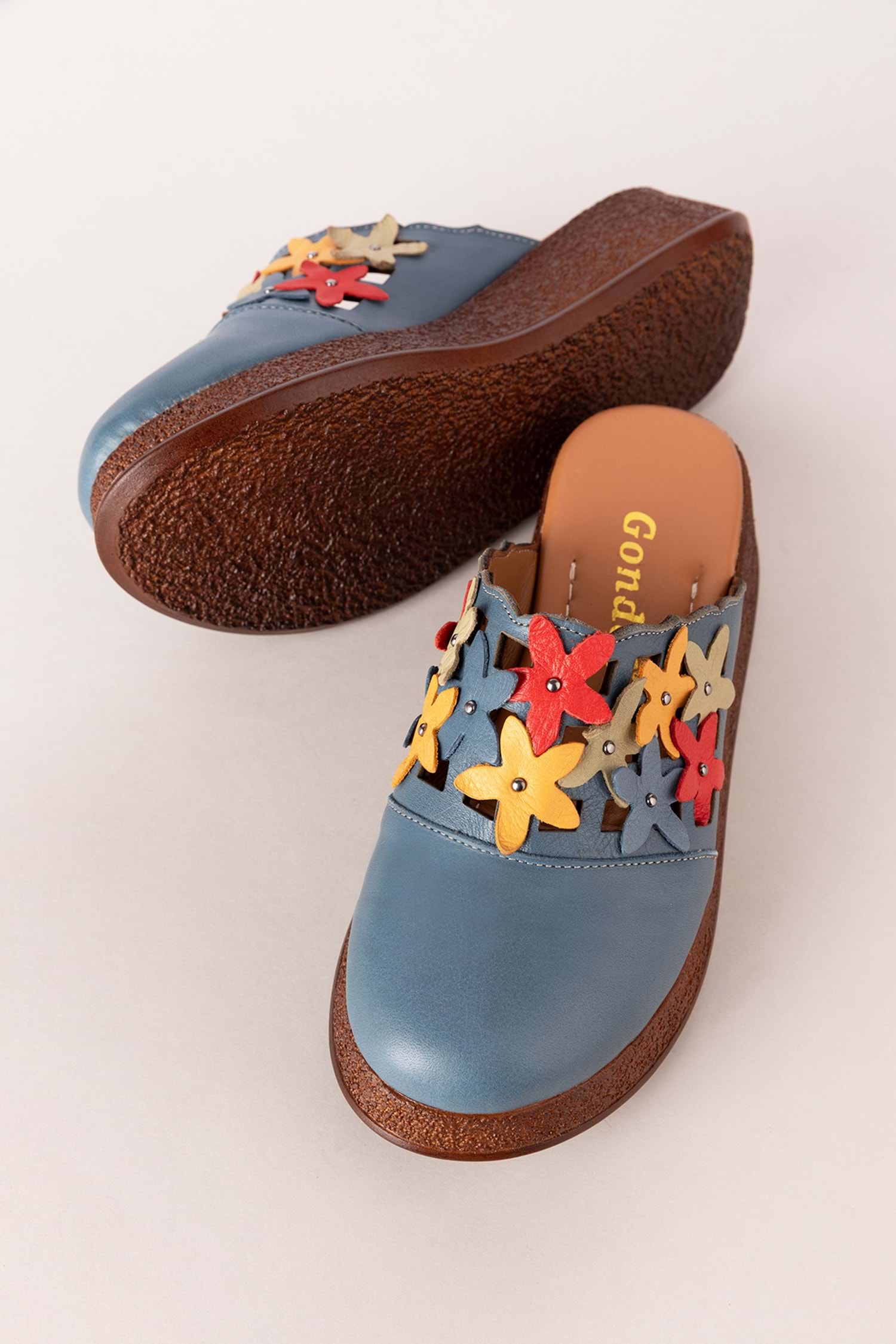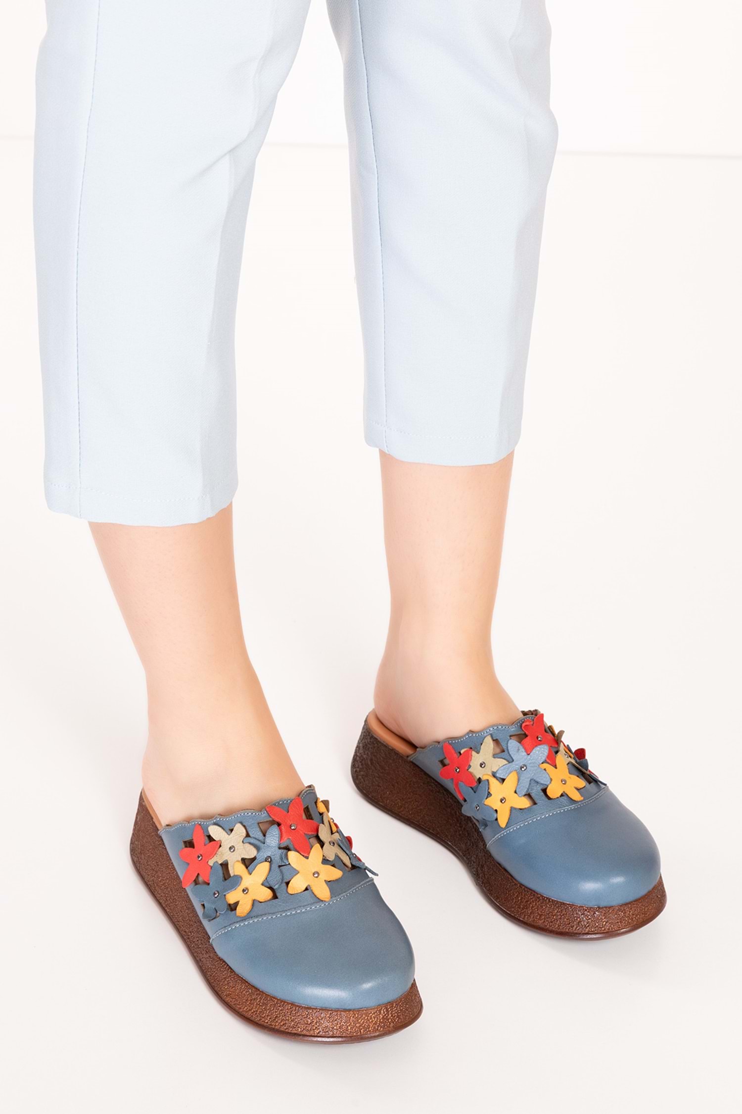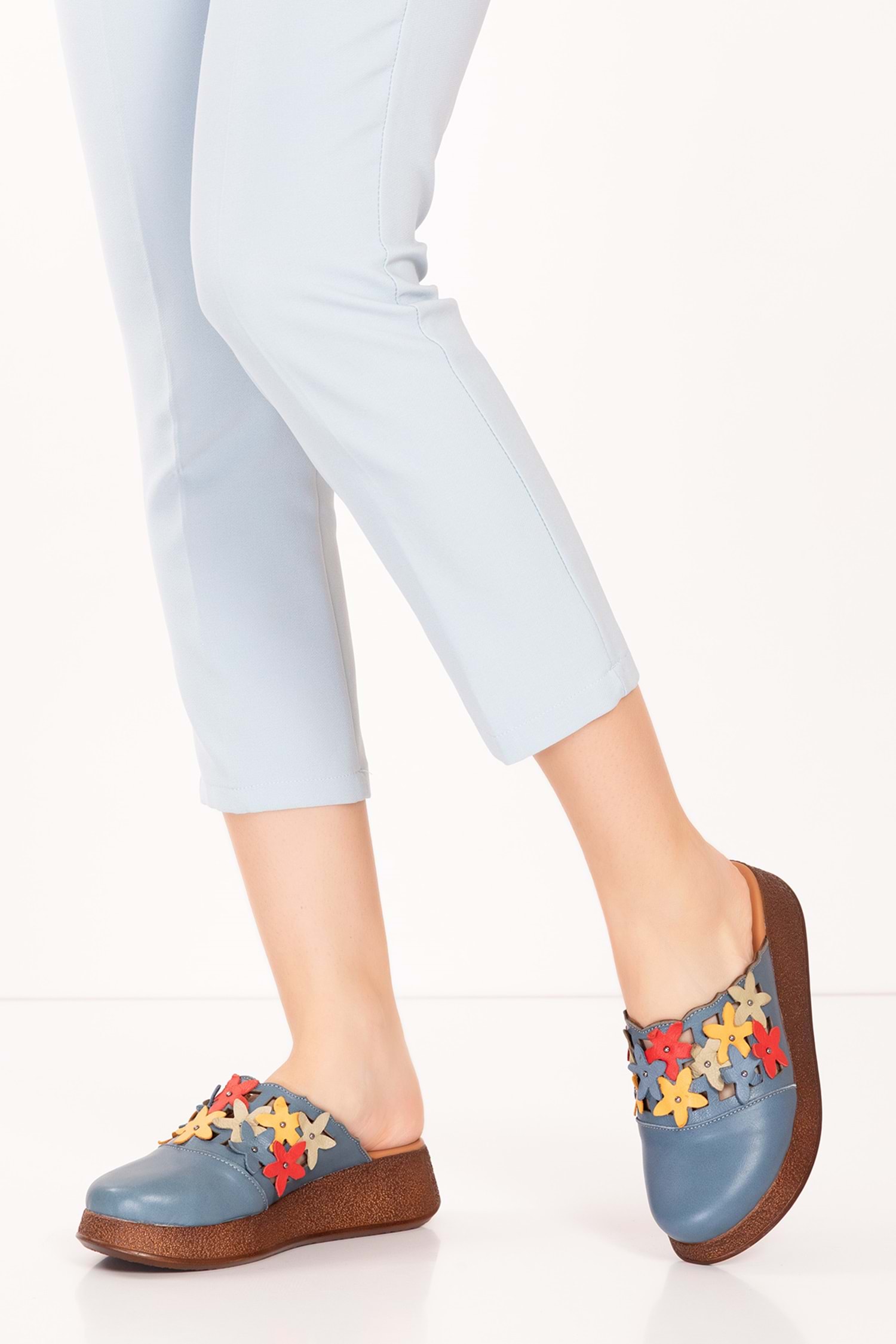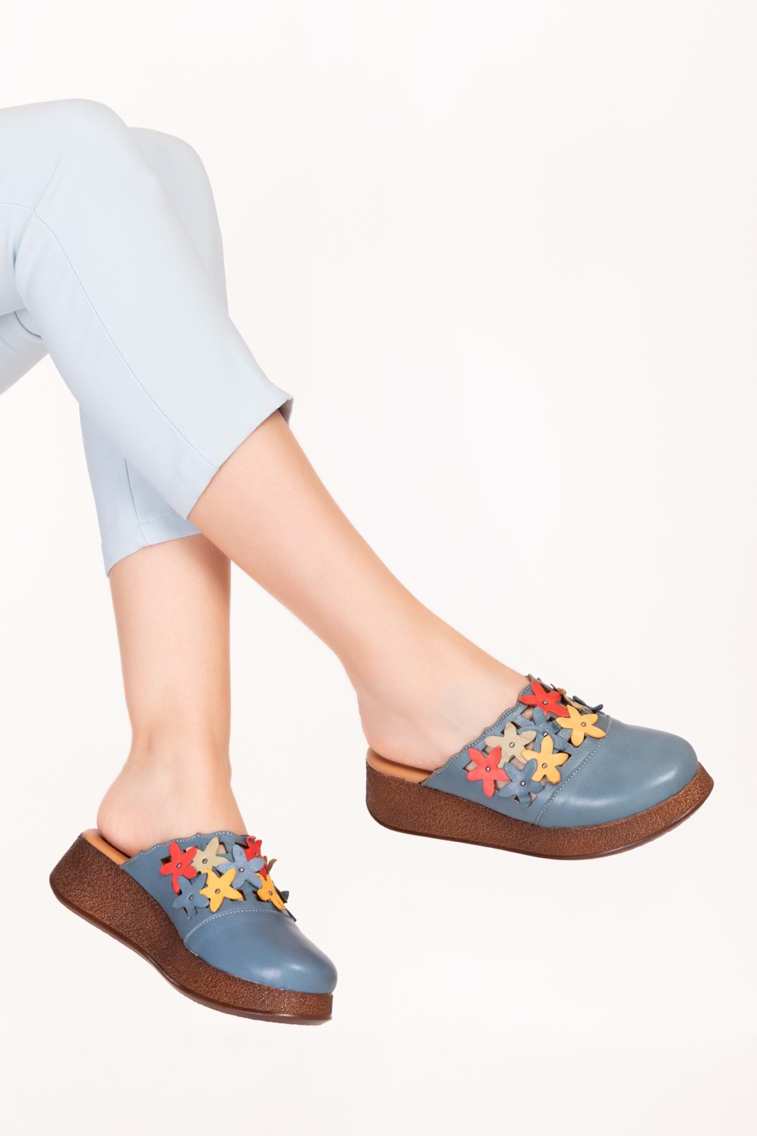 Gondol Hakiki Deri Çiçek Detaylı Sabo Terlik mlk.3232 - Mavi - 40