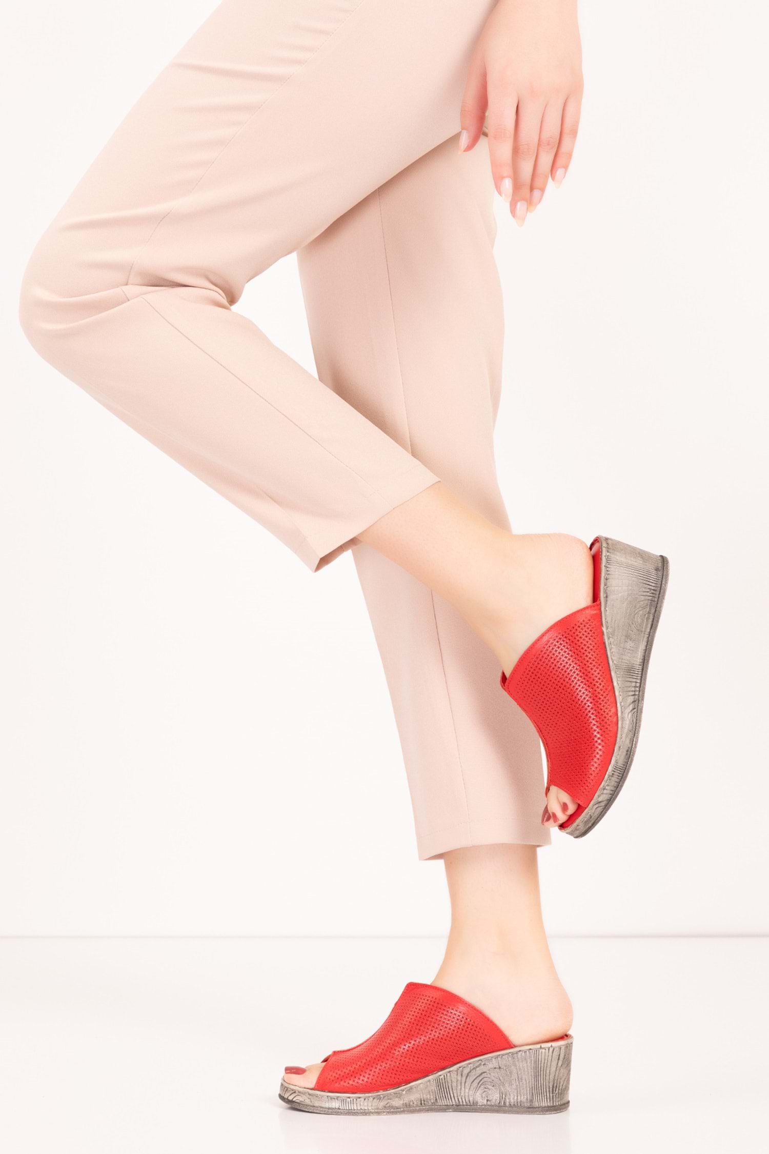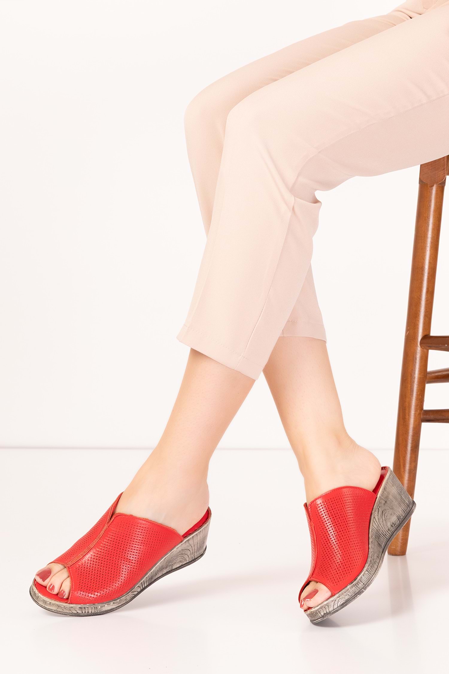 Gondol Hakiki Deri Dolgu Topuklı Yumuşak Taban Rahat Terlik irm.74 - kırmızı - 41