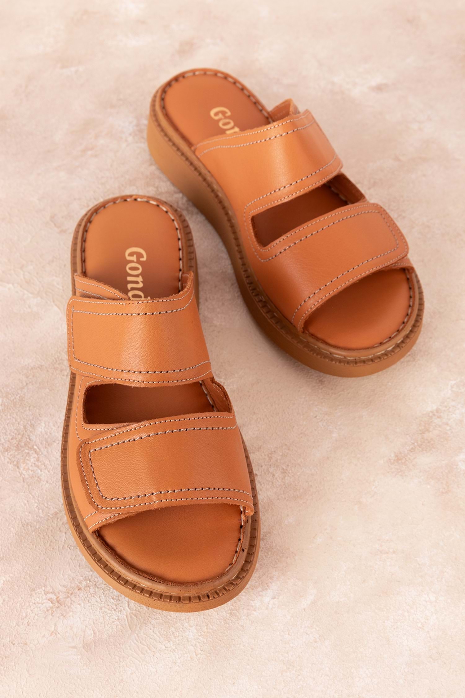 Gondol Kadın Hakiki Deri Çift Bantlı Günlük Şık Rahat Terlik usl.2472 - Taba - 41