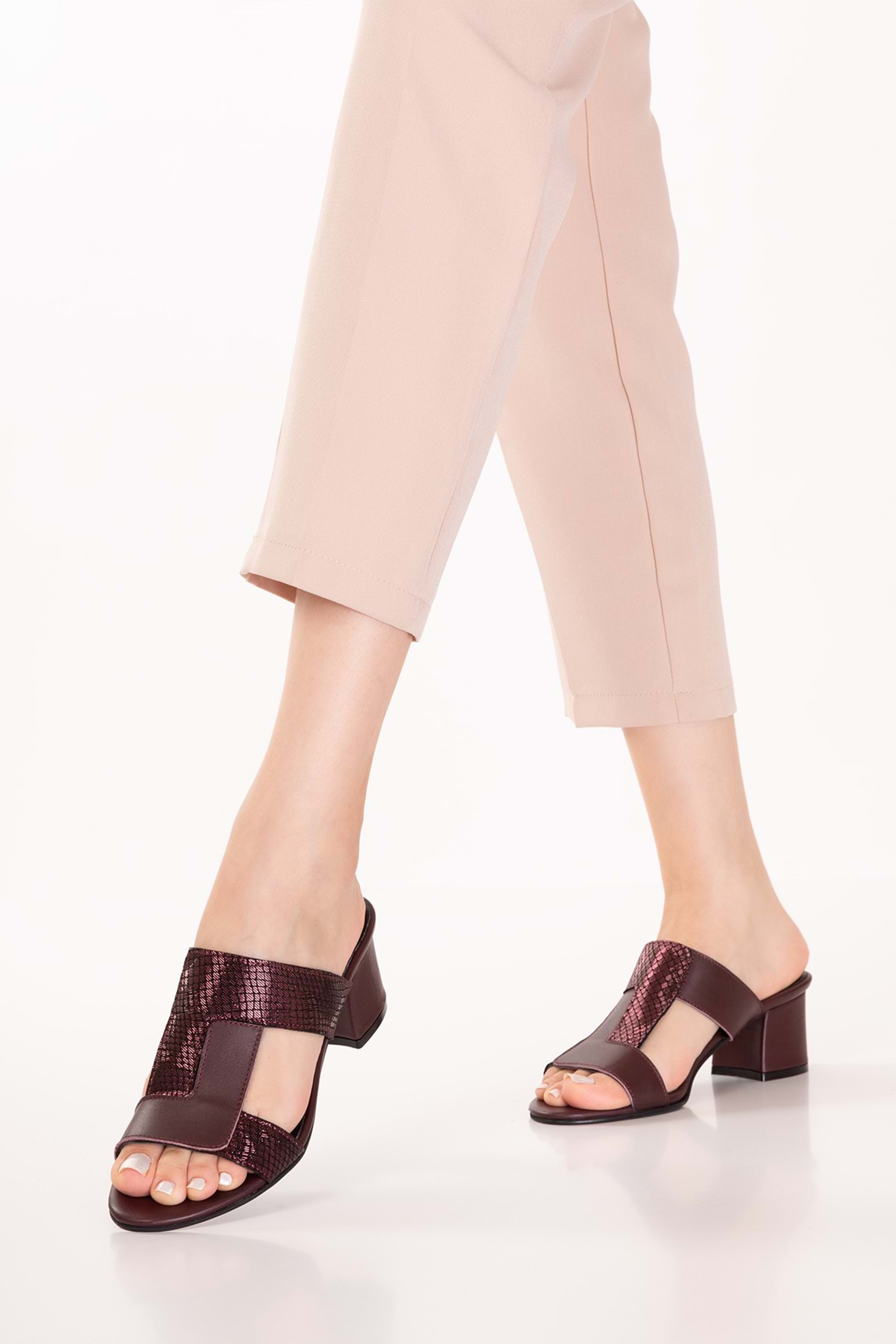 Modern formu ve güçlü dokusuyla öne çıkan topuklu terlik, zamansız şıklığı konforla birleştirir. Desenli yüzeyi ve keskin burun yapısı ayağı daha zarif gösterirken, blok topuk formu gün boyu dengeli ve rahat bir kullanım sunar.
