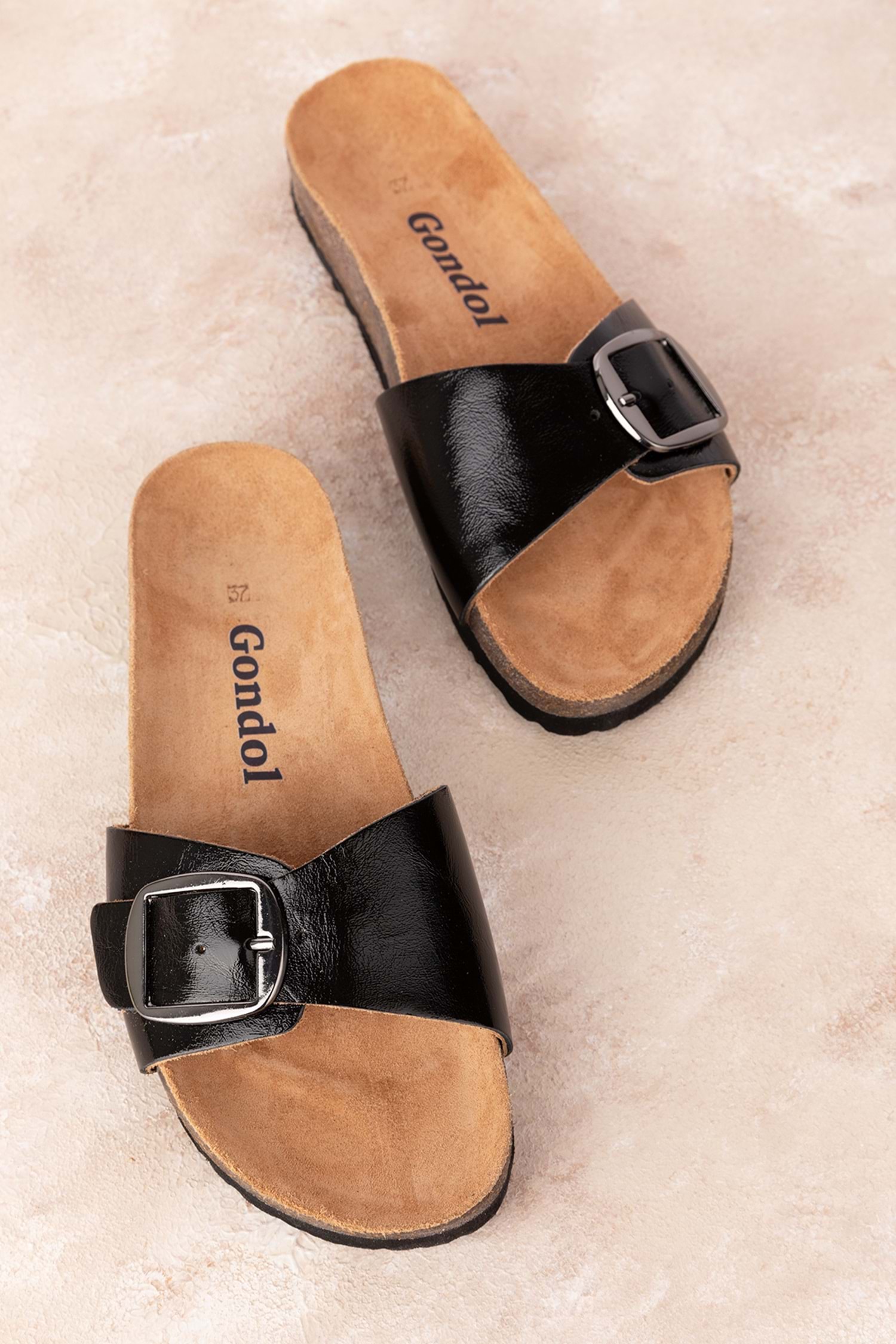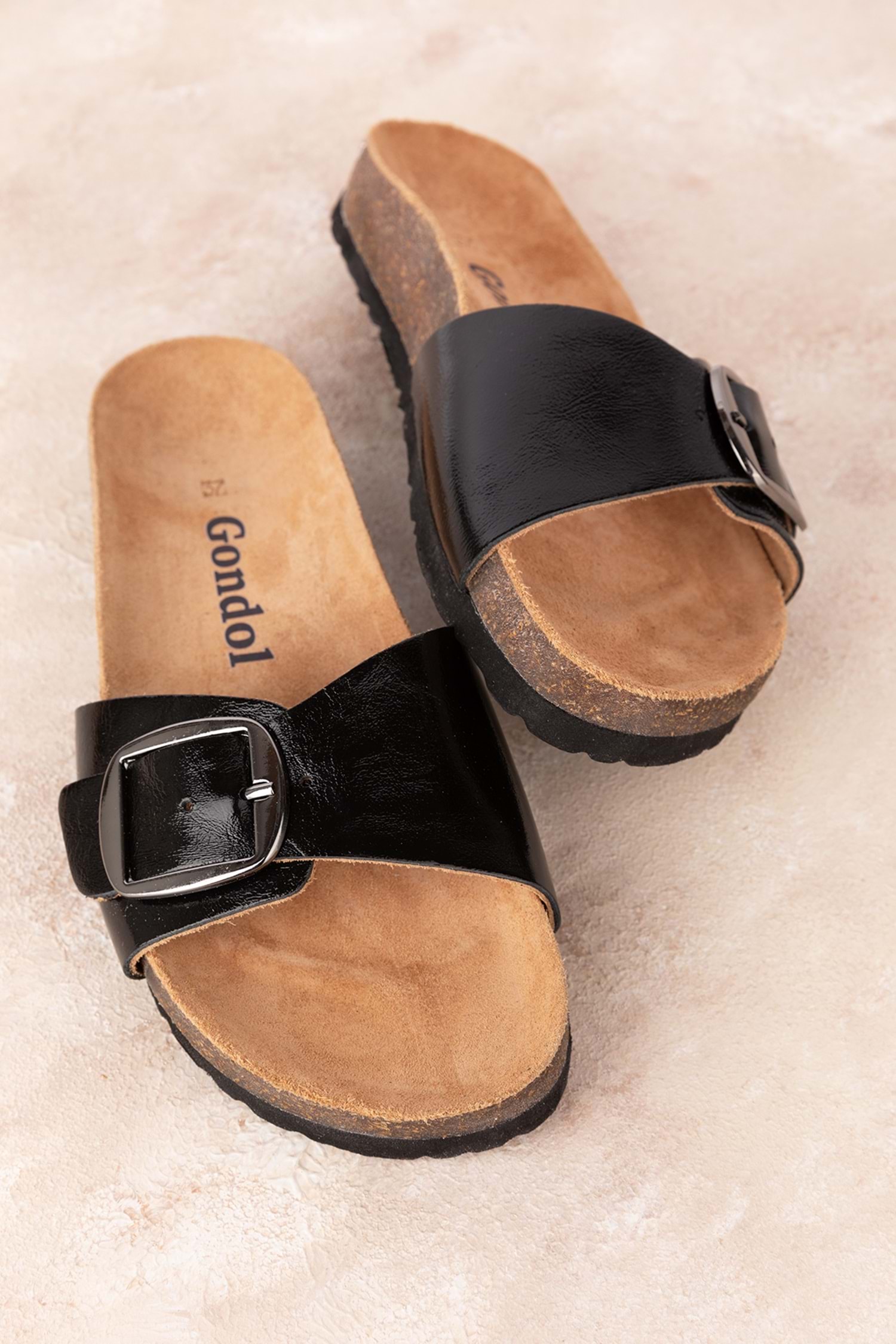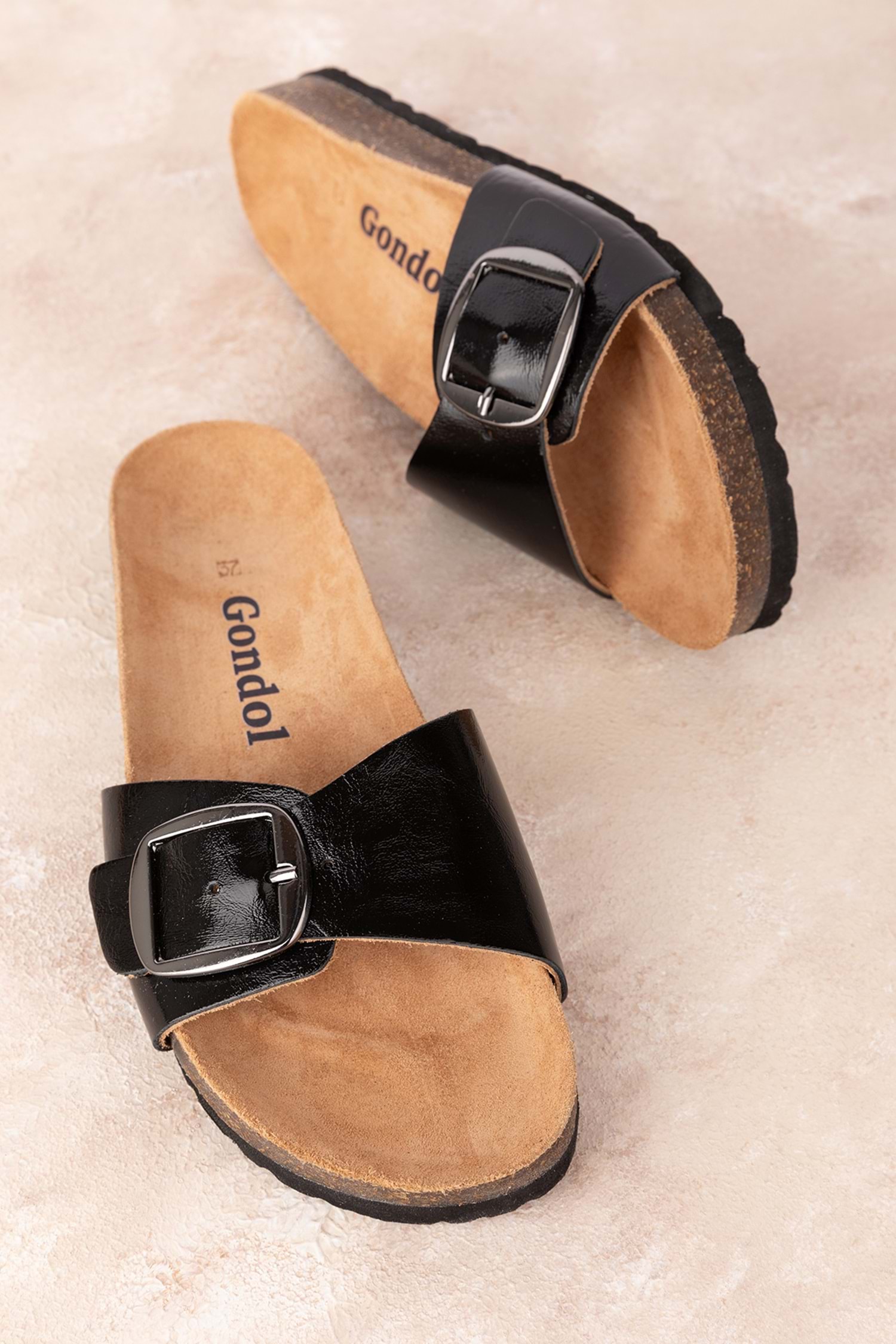 Gondol Kadın Hakiki Deri Tek Tokalı Günlük Rahat Terlik usl.2340 - siyah rugan - 37