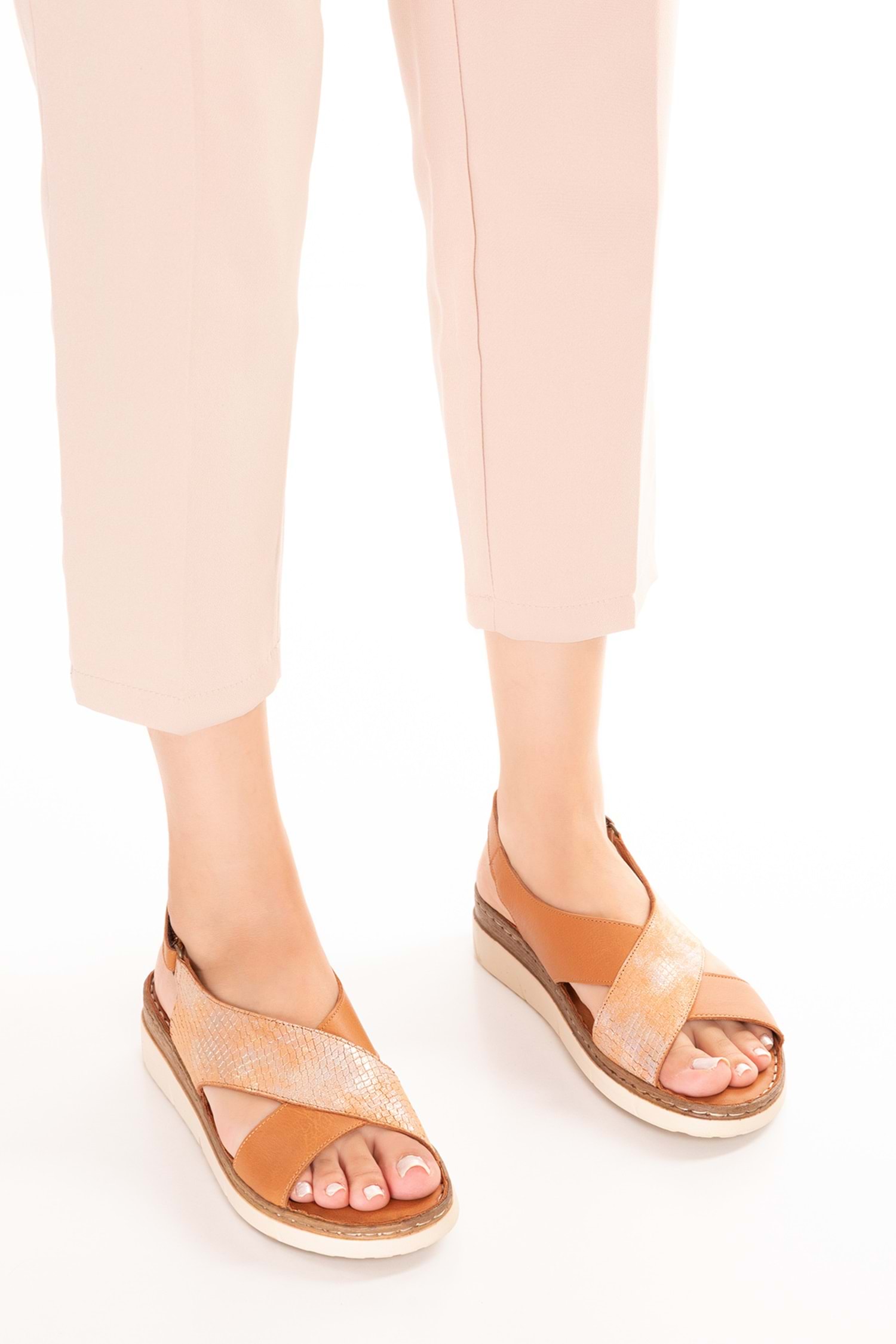 Gondol Hakiki Deri Kısa Topuklu Çapraz Sandalet asy.812 - Taba Yılan - 37