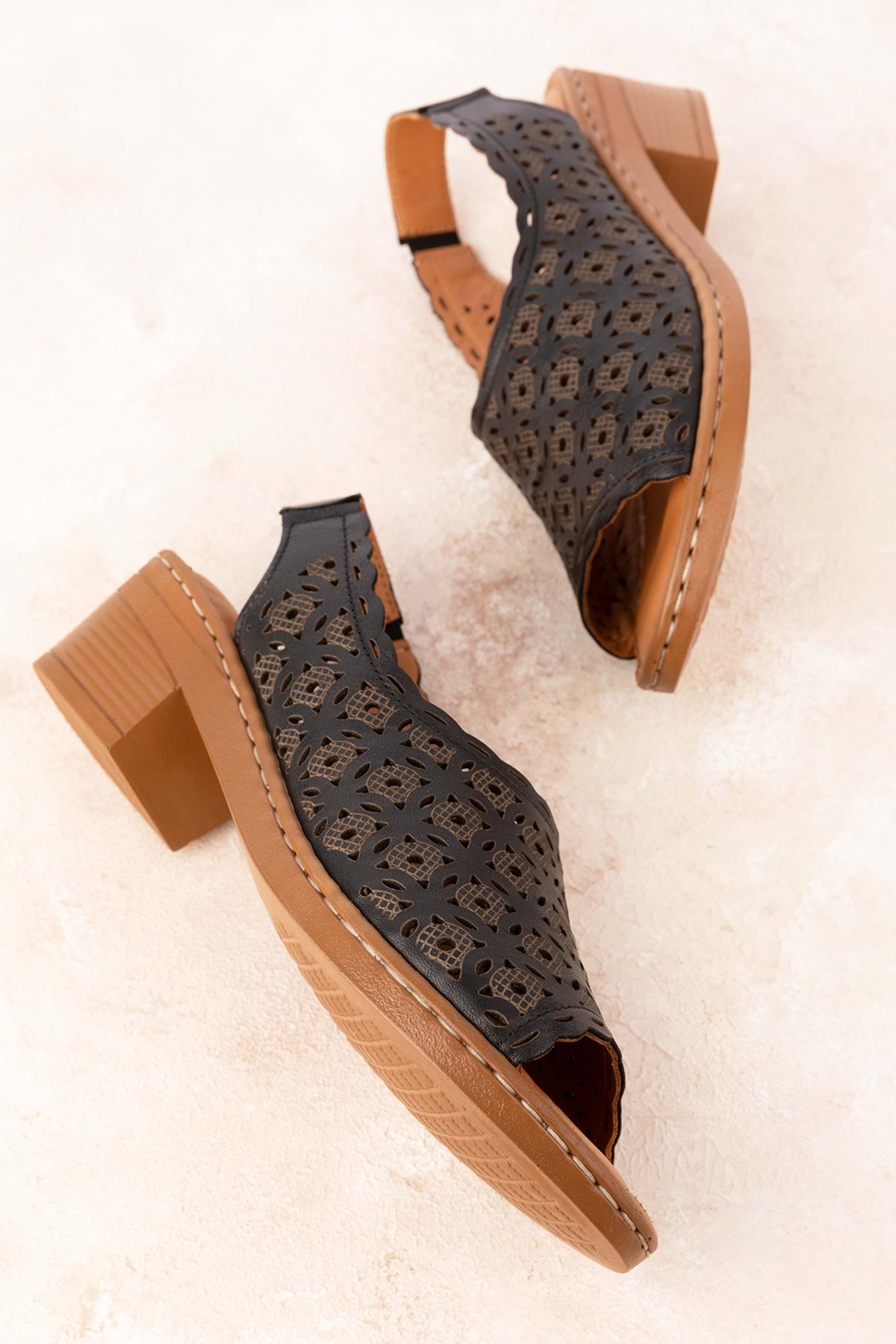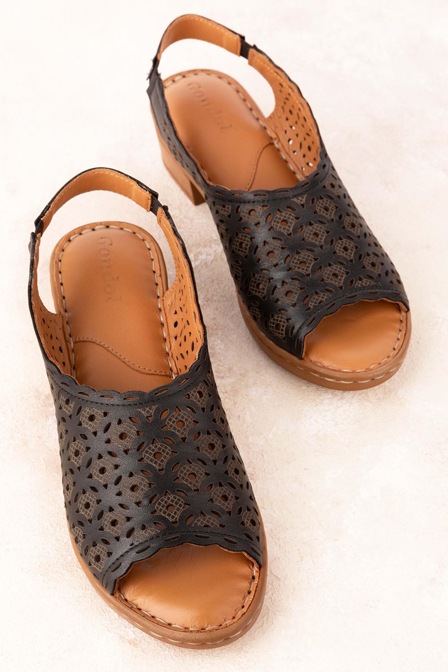 Gondol Hakiki Deri Kısa Topuklu Lazer Kesim Sandalet iz.9504 - Siyah - 36