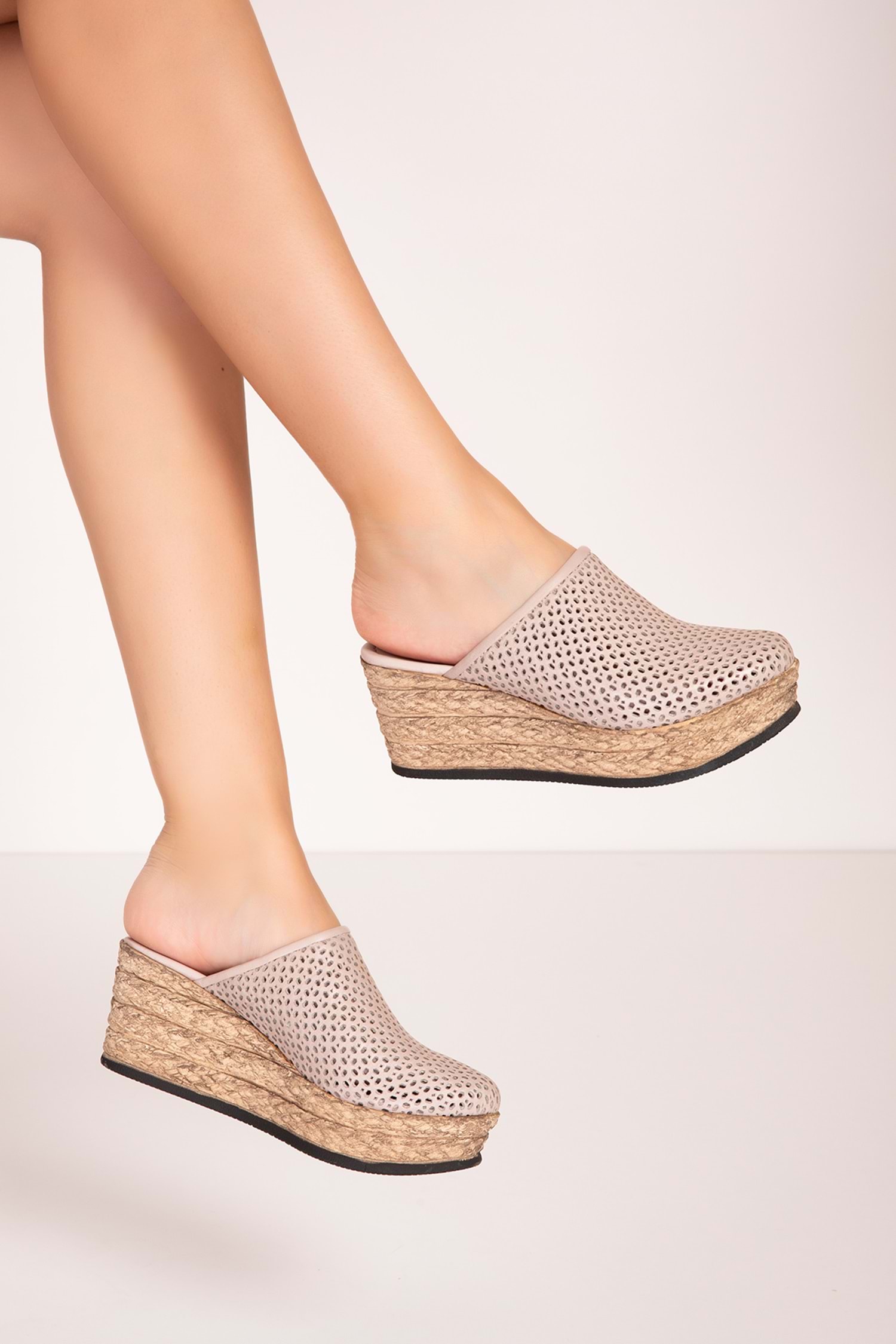 Gondol Hakiki Deri Dolgu Topuklu Hasır Görünümlü Terlik alpx.7081 - Gri - 38